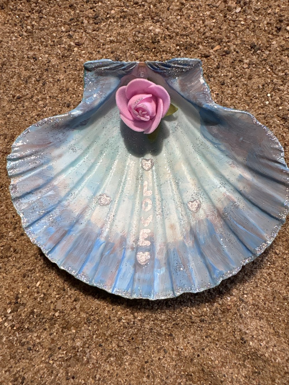 Peinte et pailletée représentant le ciel avec une rose et des cœurs brillants écriture Love