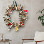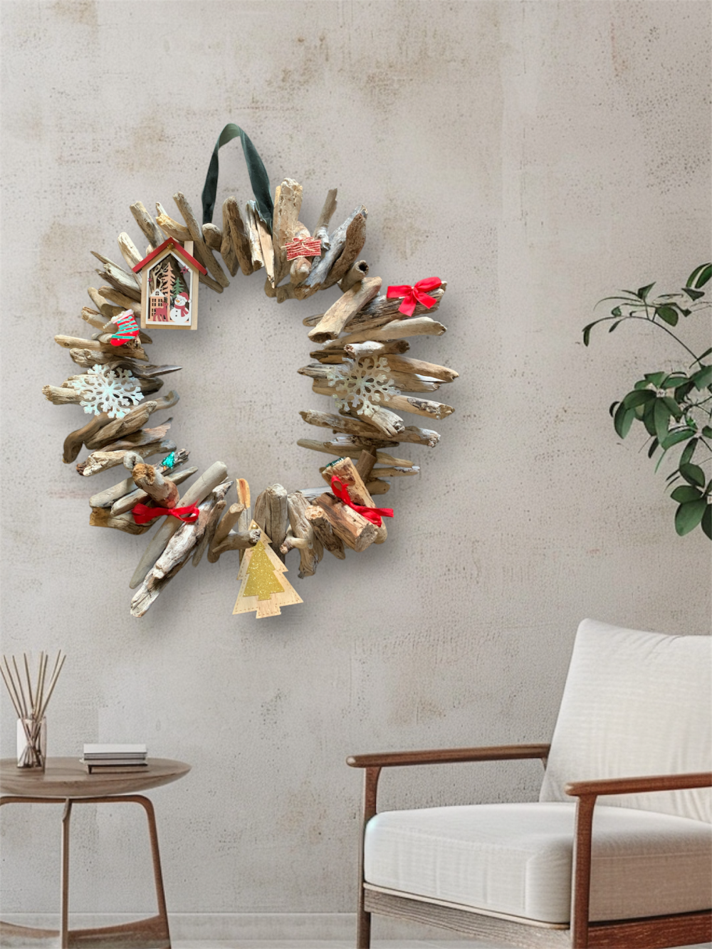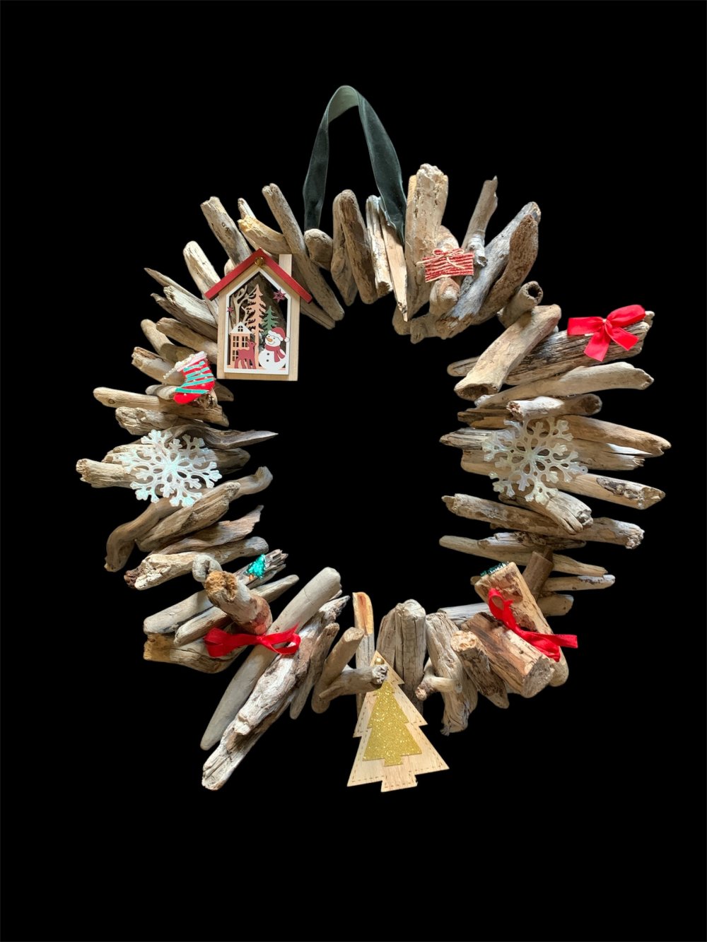 Couronne de Noël, originale, en bois flotté. Décoration murale pour Noël. Fabrication artisanale en bois flotté pour Noël. Couronne en bois flotté pour Noël. Création Made in France en bois flotté pour Noël. Pièce unique. Diamètre: 45 cm.