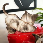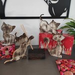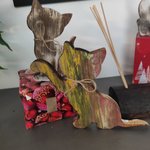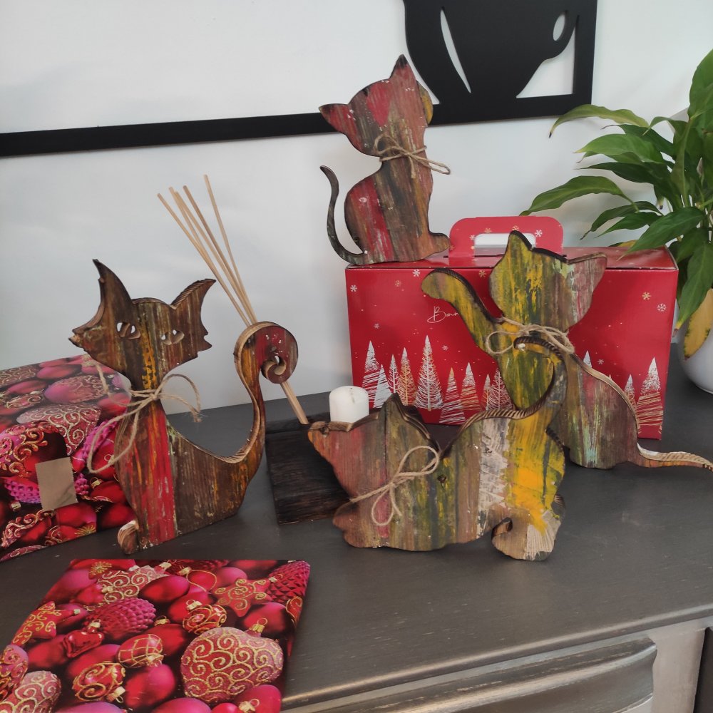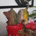 Les chats sont en bois de récupération peint par touche de couleur et racler sur une face et sur l'autre bois brûle et peinture.