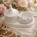 Composé d’un pot avec couvercle délicatement texturé, d’un bol en forme de fleur et de son plateau assorti, cet ensemble apportera une touche élégante, douce et raffinée à votre intérieur.