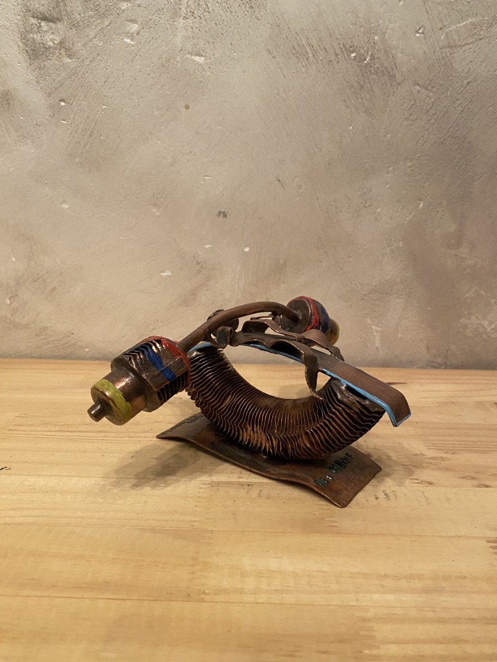 Le cuivre, le laiton ou encore le bronze plus rarement ; je récupère, frappe, scie, soude afin de créer toutes sortes d’objets et personnages.
