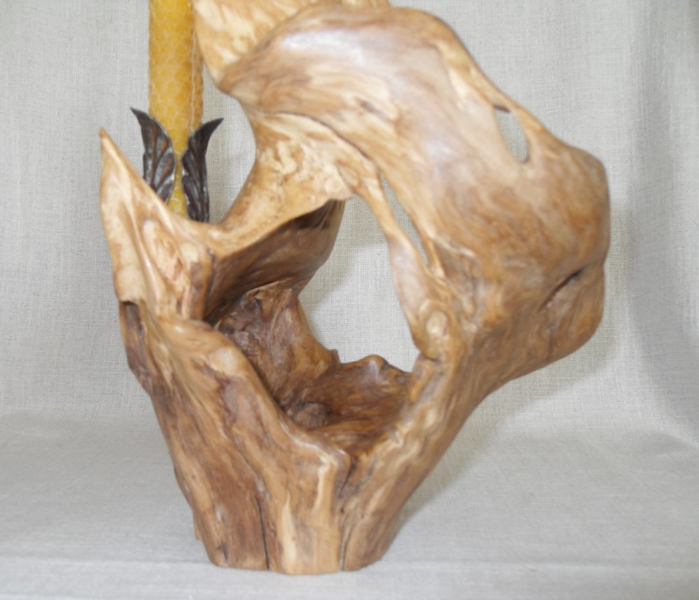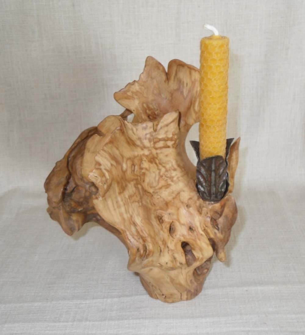 Grand bougeoir en bois avec sa bougie en cire d'abeille gaufrée