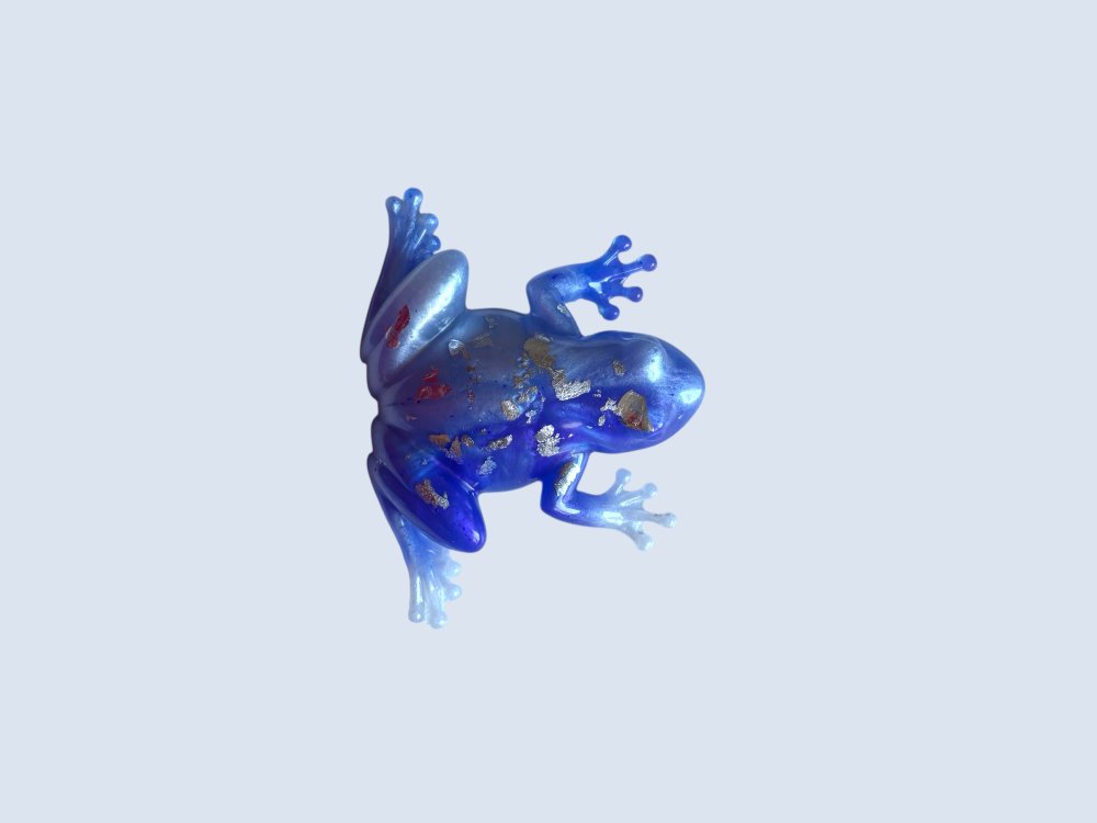 Tons bleus et blancs nacrés. Grenouille double tons et feuilles d'argent.