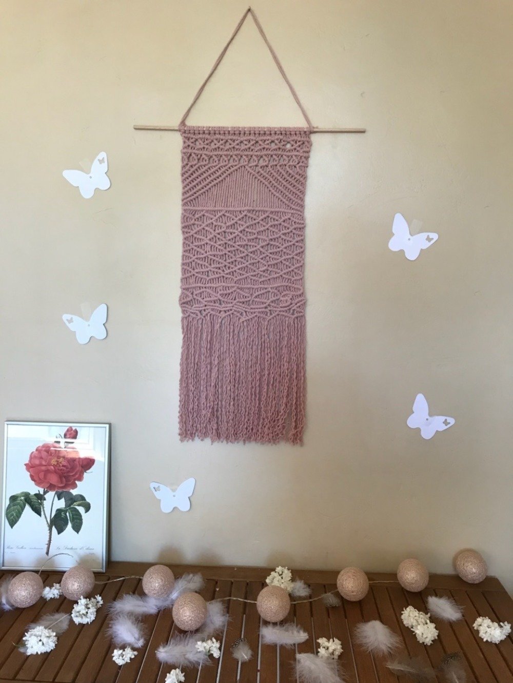 Réalisé à la main ce macramé rose parme est posé sur une tige en bois de 45cm et fait 65 cm de hauteur. Par sa couleur tendre il ornera votre mur avec beaucoup d effets.
