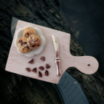 Ils représentent une assiette en porcelaine remplie de petits cookies et d’éclats de chocolat en pâte polymère, accompagnée d’un couteau, évoquant la douceur et la convivialité des moments gourmands.