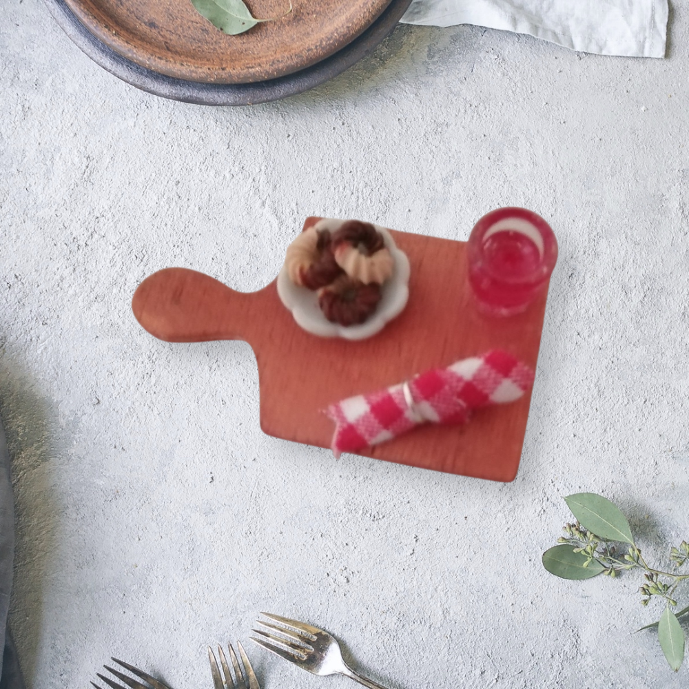 Vous découvrirez une adorable assiette en porcelaine remplie de petits gâteaux en pâte polymère, accompagnée d’un verre de grenadine et d’une serviette roulée, pour une ambiance conviviale et appétissante.