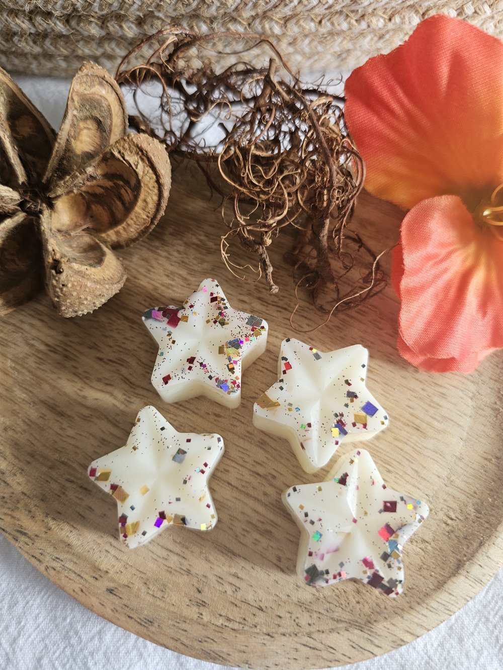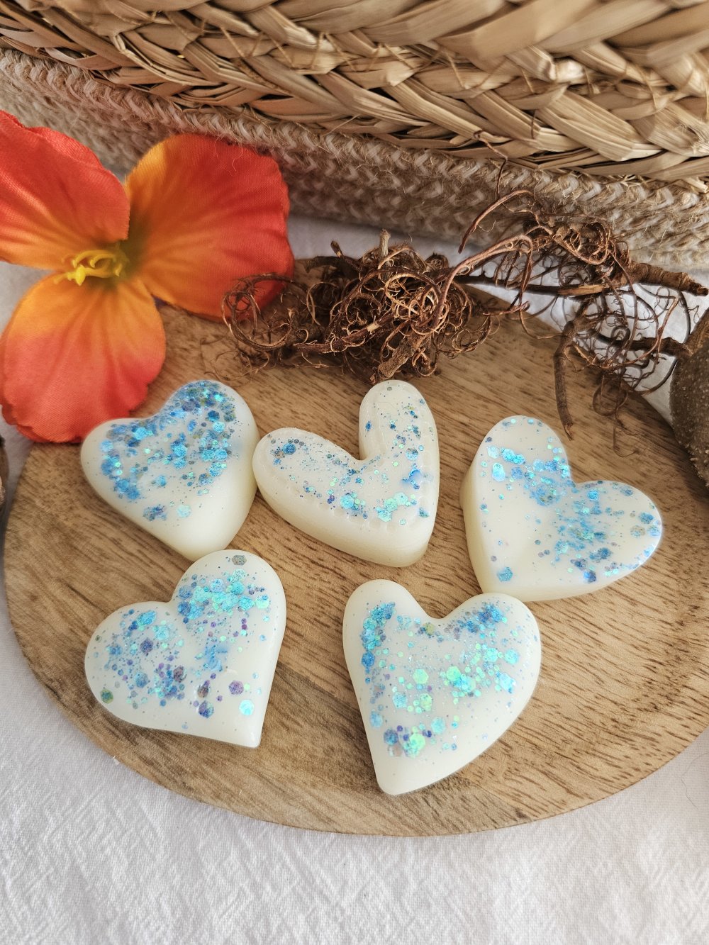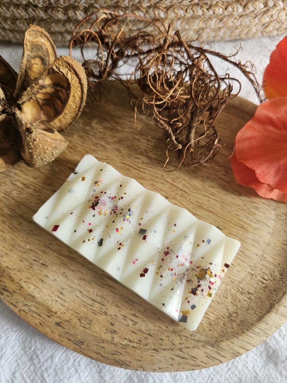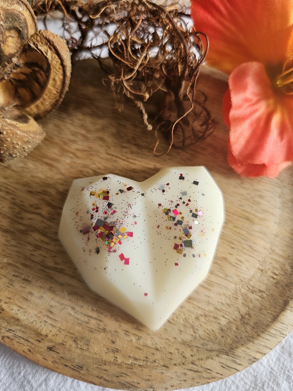 Fabriqué à la main en France à partir de cire d'olive 100% naturelle et colorée avec de la poudre de MICA et/ou paillettes.