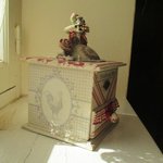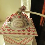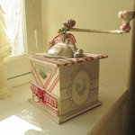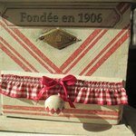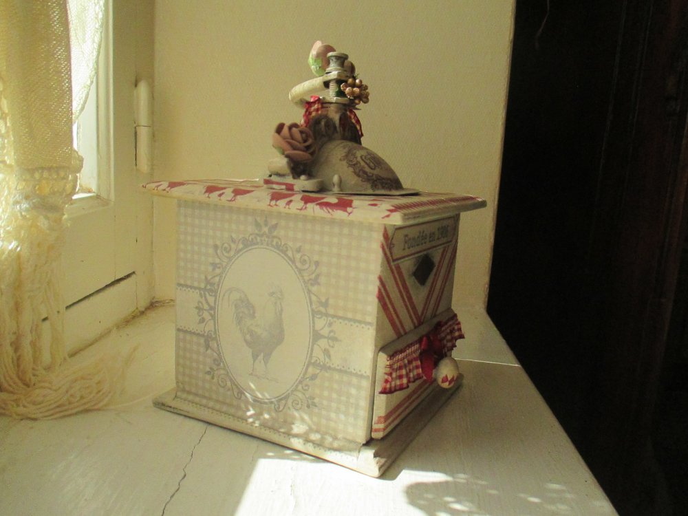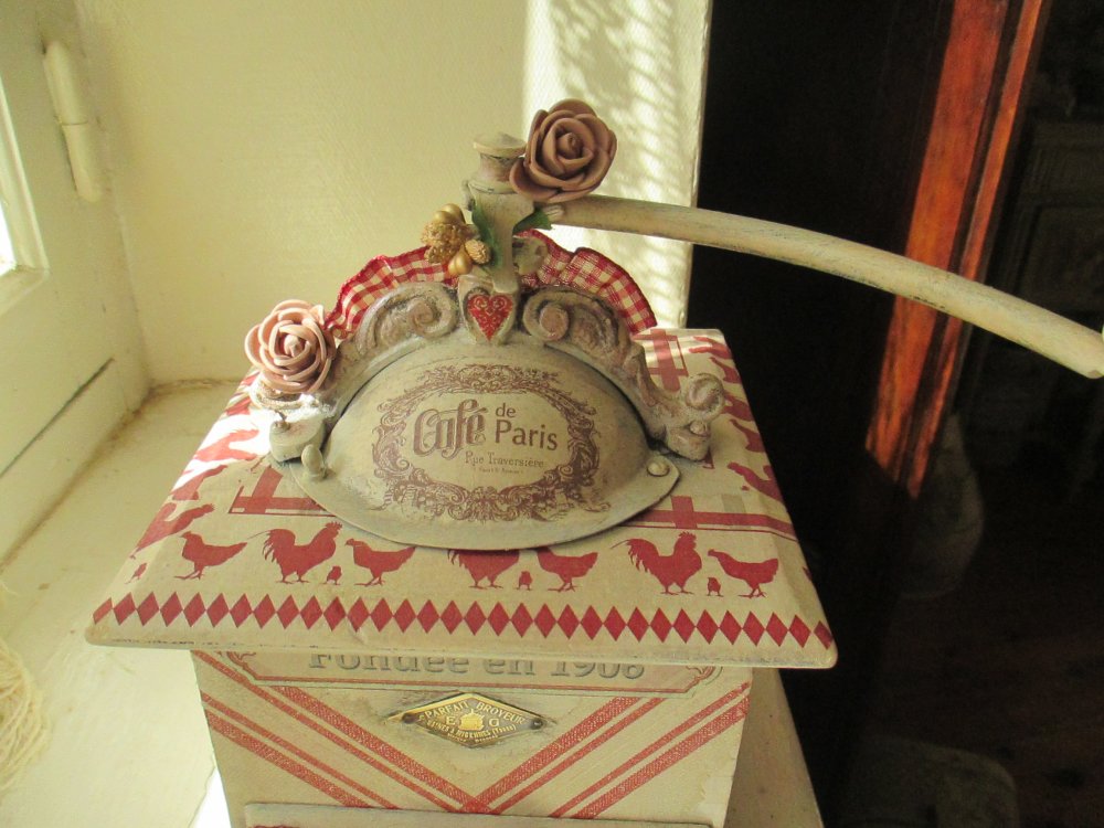 Décors : Patiné lin, taupe, coq et poules, enseigne " Café de Paris " dentelles anciennes, galon guipure froncée beige et rouge, fleurs tissu, nœud organsa, plaque laiton " Le parfait broyeur "