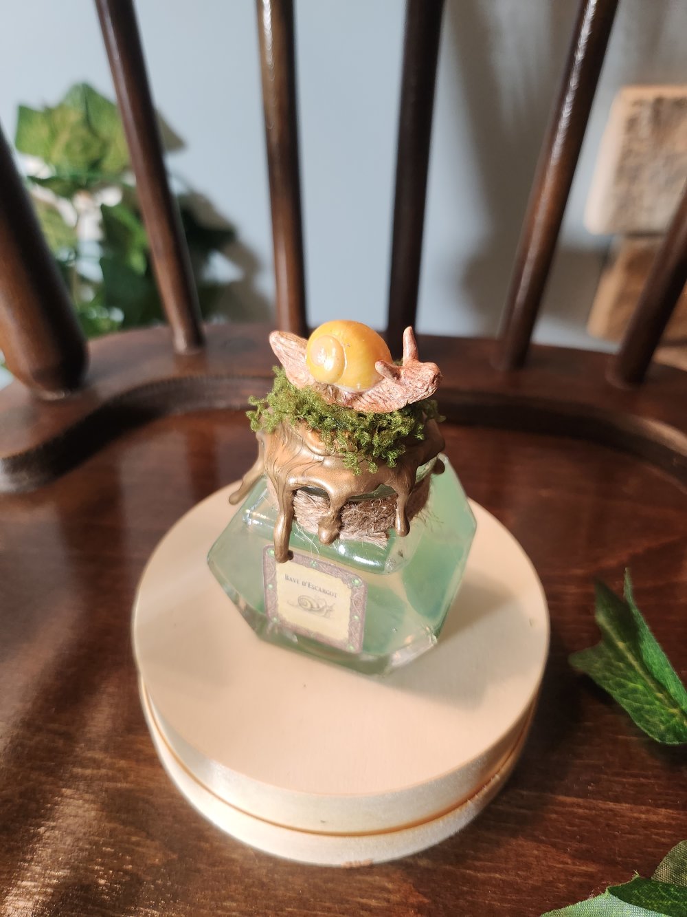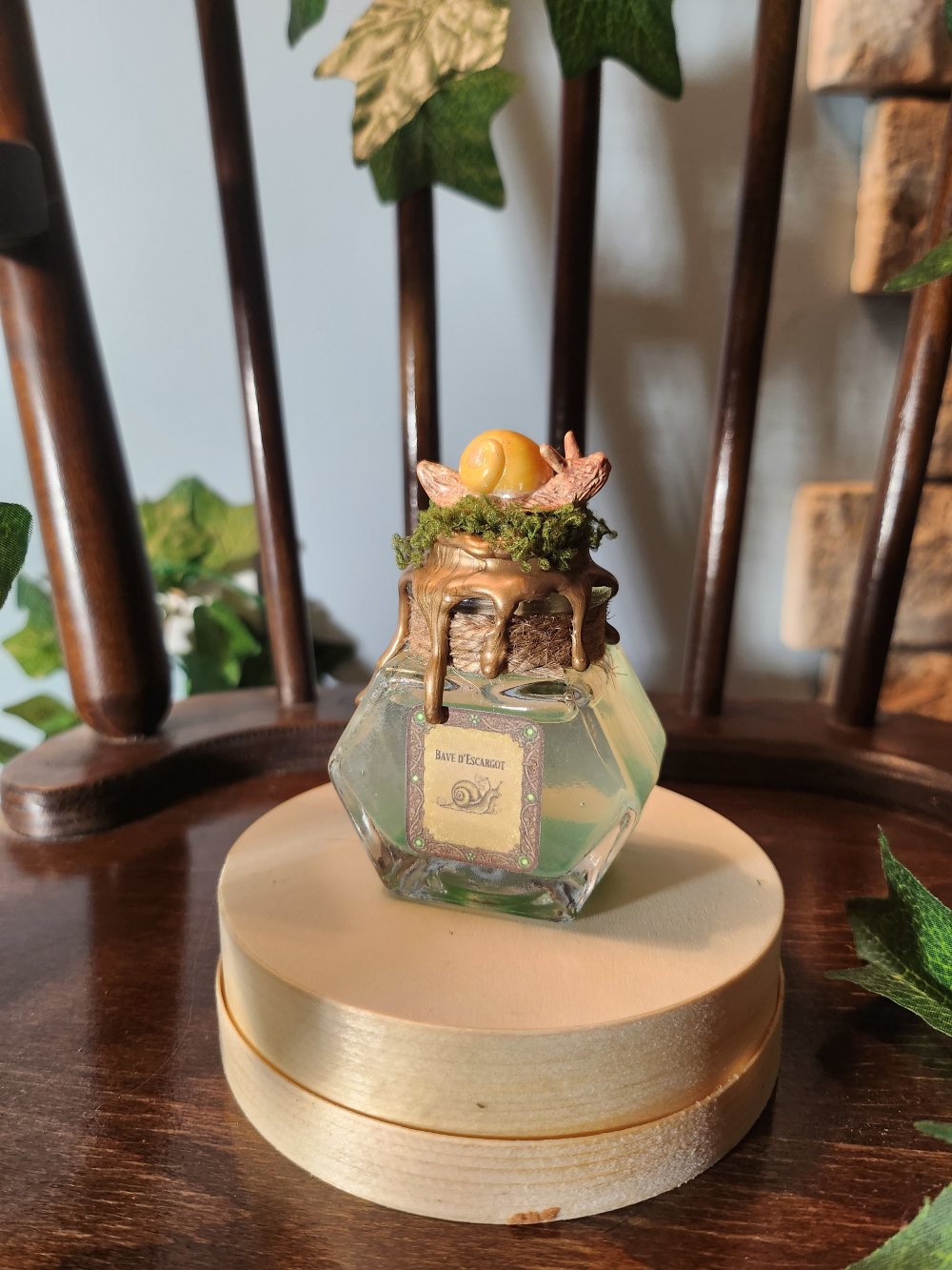 Flacon scellé d’un bouchon recouvert de cire orné d' un escargot avec une étiquette décorative.