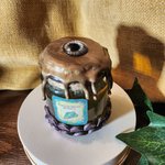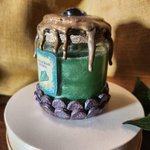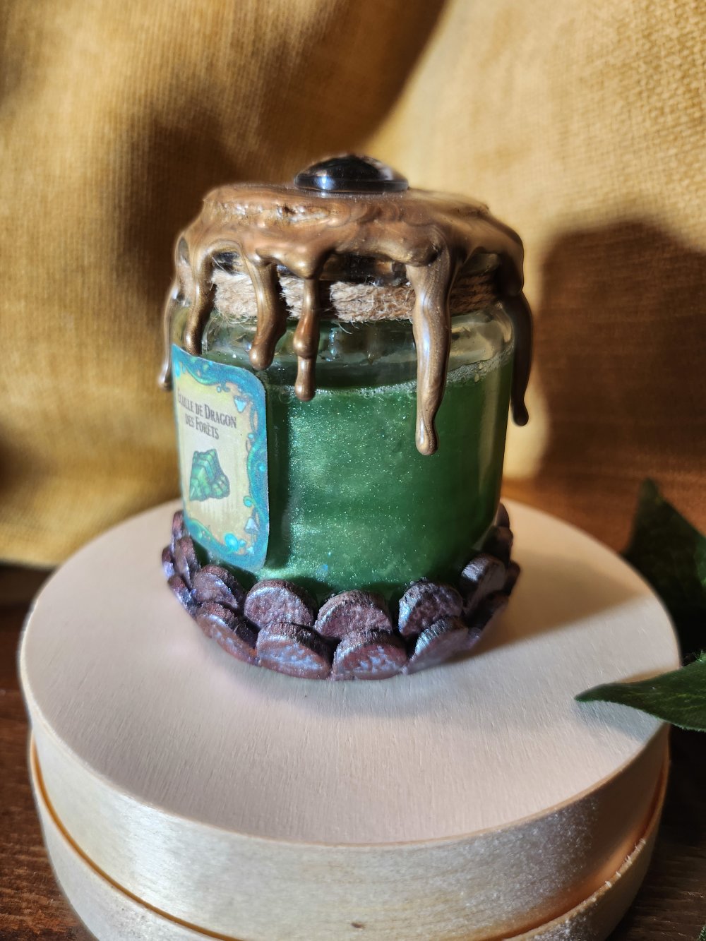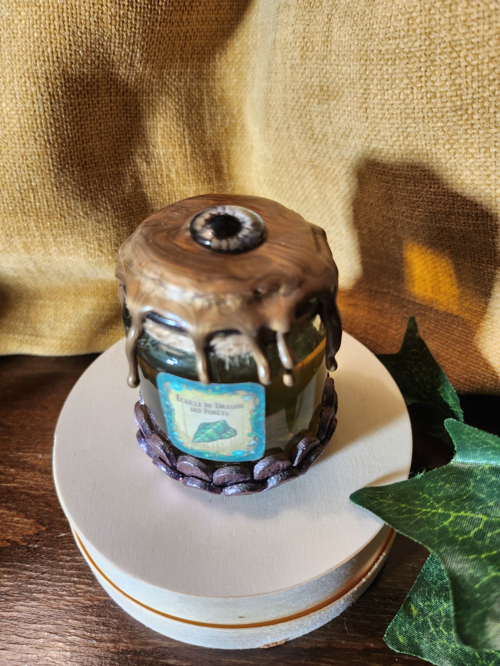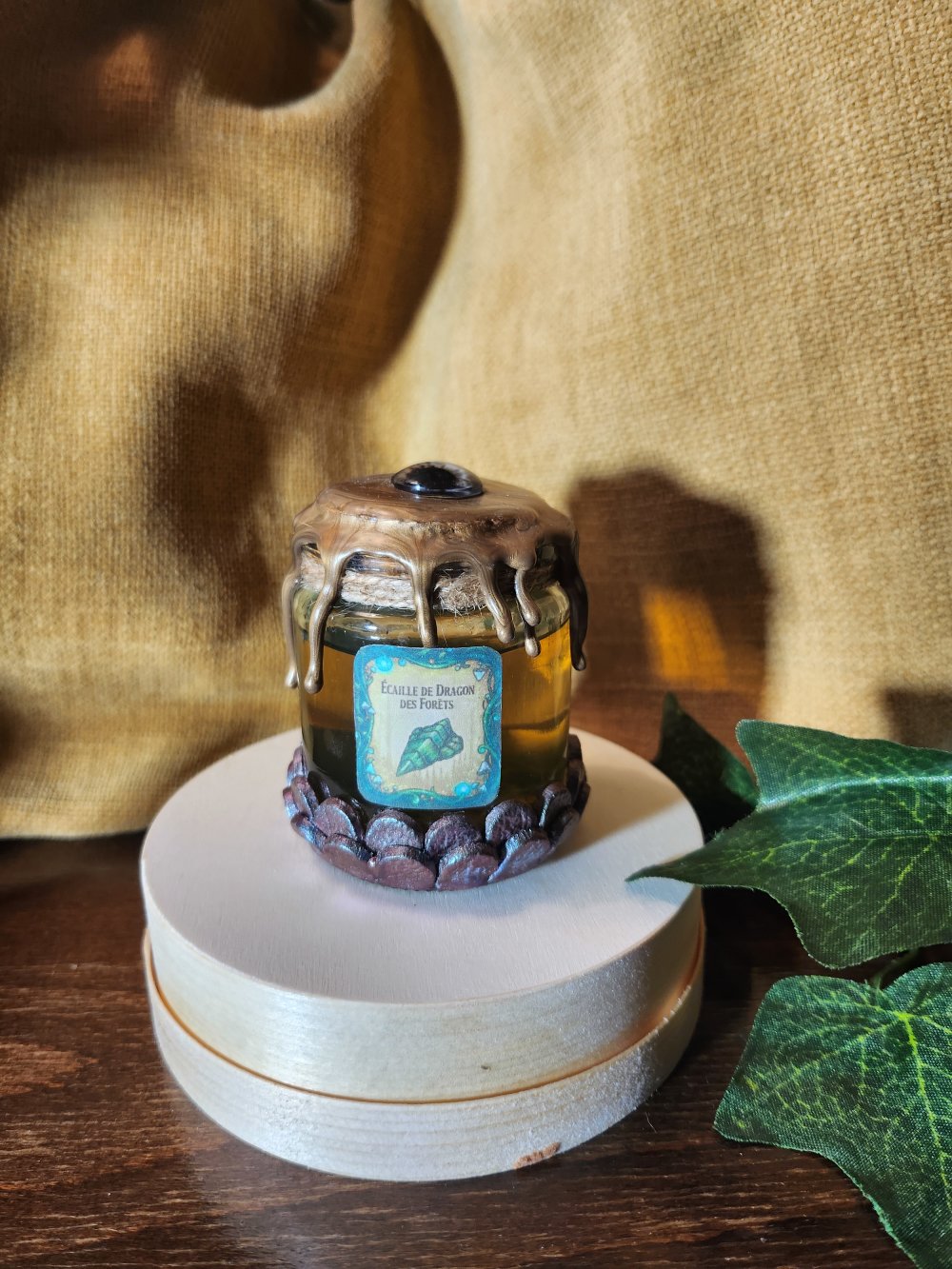 Flacon en verre scellé d’un bouchon recouvert de cire, decoré d'écailles et oeil du dragon, avec une étiquette décorative.
