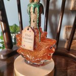 Flacon scellé d’un bouchon recouvert de cire orné de petit glands, avec une étiquette décorative.