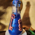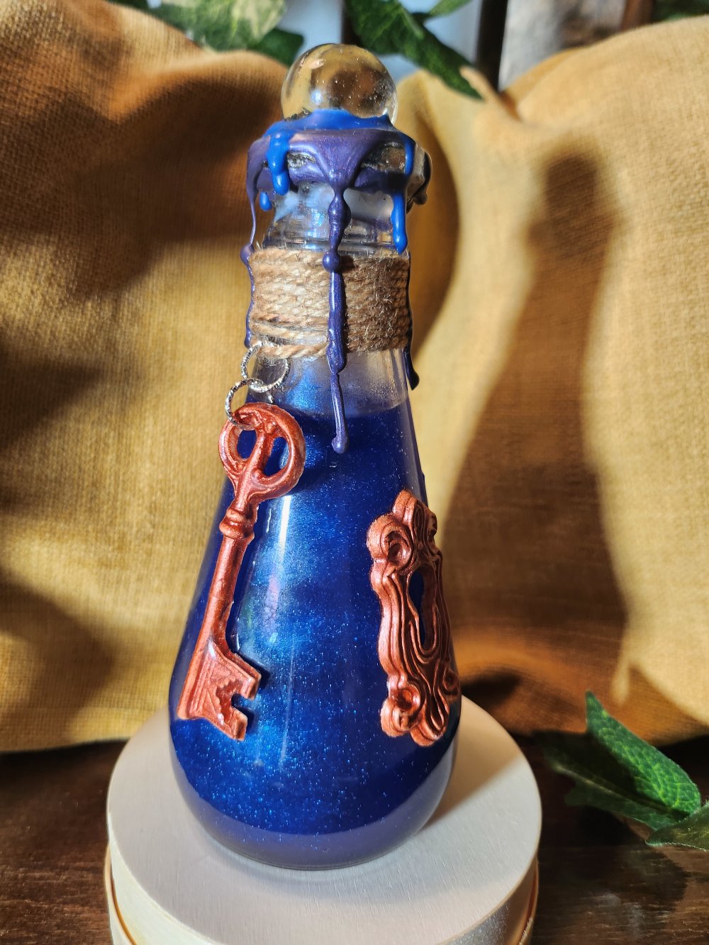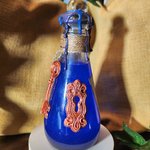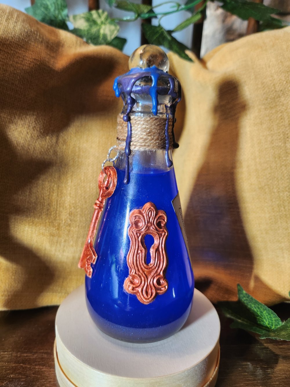 Flacon en verre scellé d’un bouchon recouvert de cire agrémenté de fil et décoré d'une clé et d'une serrure avec une étiquette décorative.