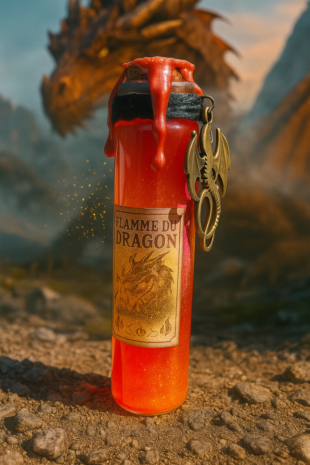 Un élixir rouge orangé aux reflets d’or qui s’animent quand on le secoue. Fabriqué à la main avec soin, ce flacon en verre de 20 ml évoque la puissance mystique des dragons. Parfait pour la déco, les rituels ou les collectionneurs de magie. 🐉