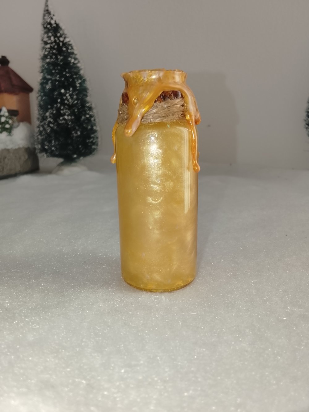 Sous son bouchon scellé de cire dorée, cette fiole renferme un souffle lumineux, une danse nacrée d’étoiles jaunes et de vaguelettes dorées. Chaque mouvement évoque un vœu chuchoté à sa bonne étoile, une promesse douce d’espoir et de renouveau.