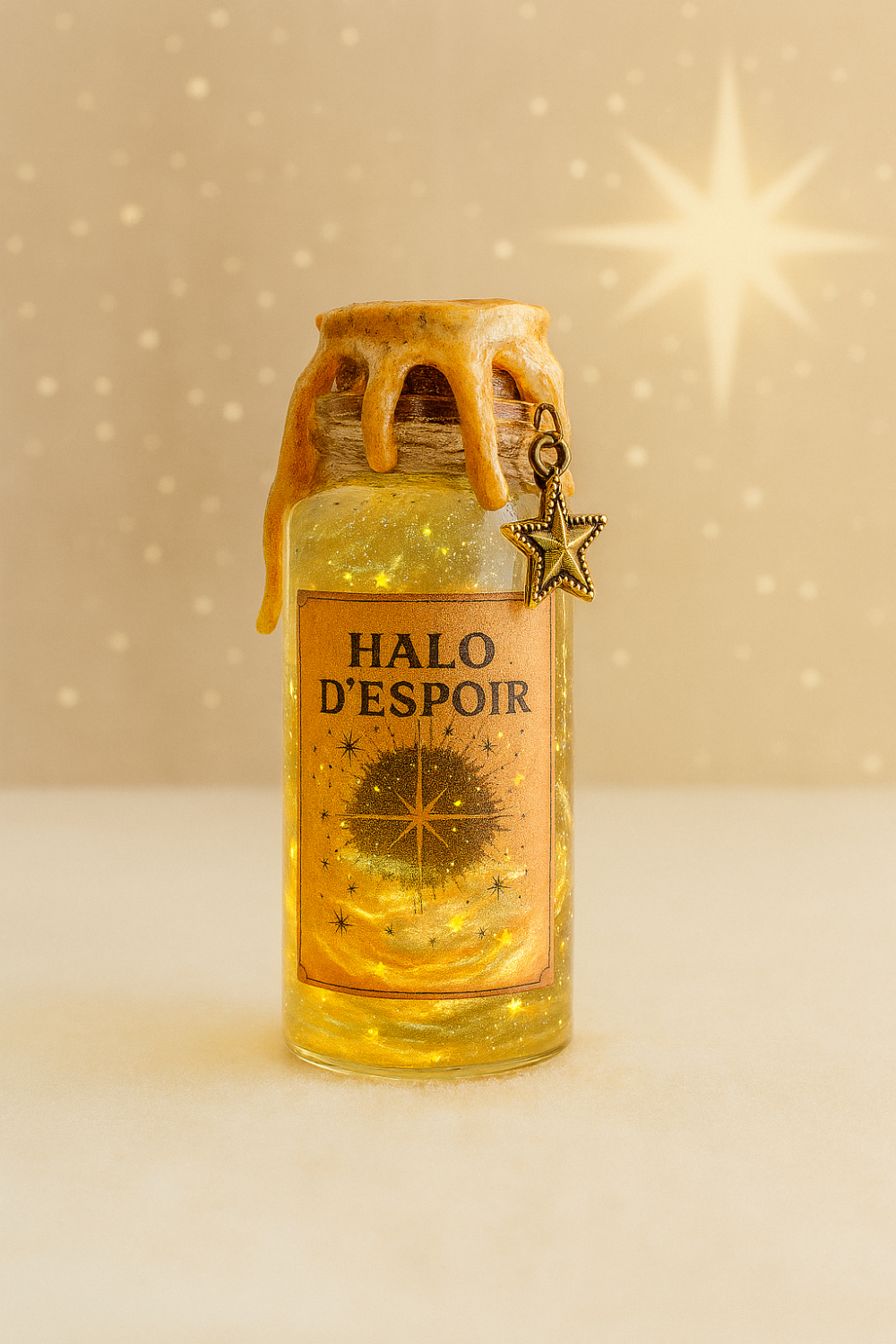 Potion Halo d’espoir : transparente, elle se transforme en or scintillant avec des étoiles lorsque tu la secoues. Fait main pour capturer la magie des vœux et des prières.
