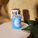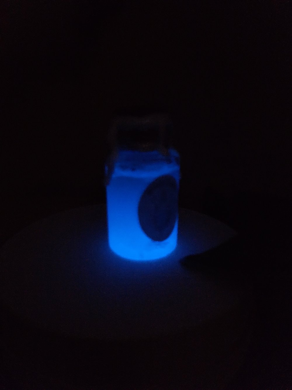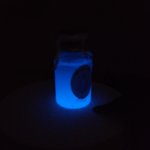 Flacon en verre scellé d’un bouchon recouvert de cire, avec une étiquette décorative. Potion phosphorescente, Secouez-la devant une source de lumière puis observez la dans le noir total.