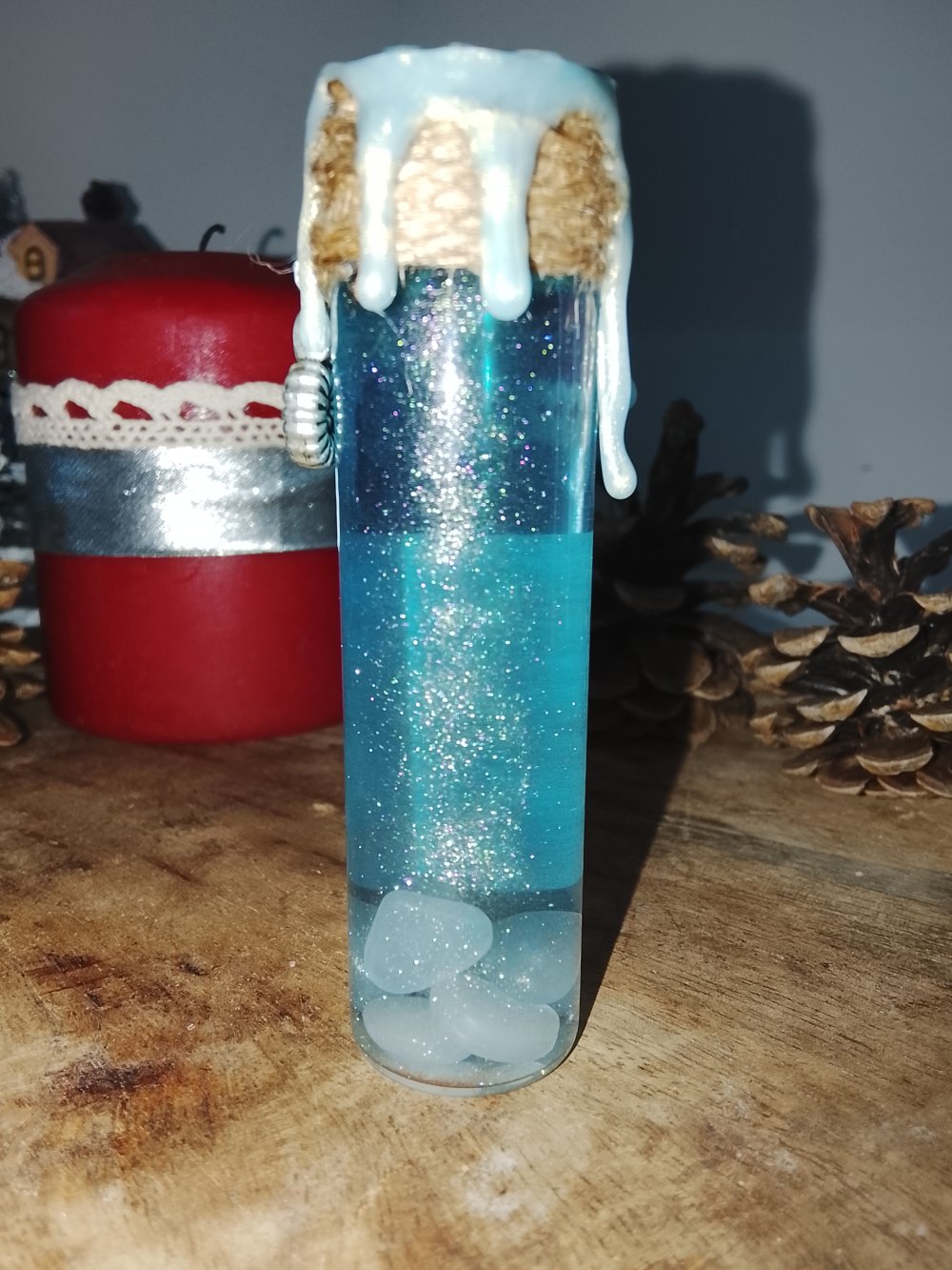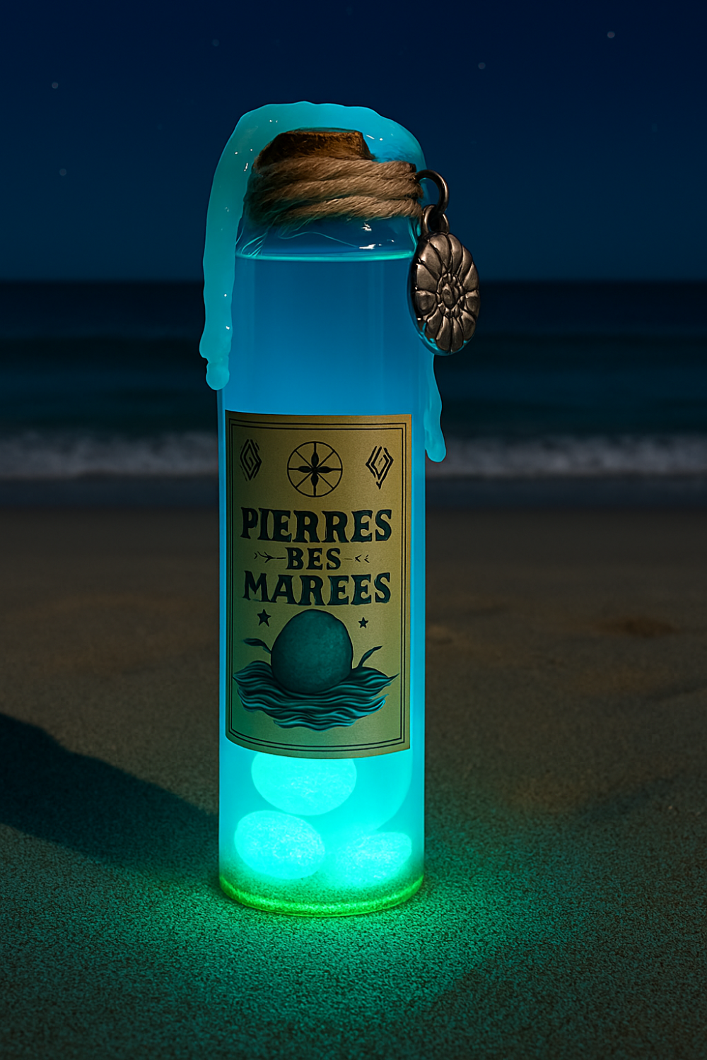 Potion artisanale de 20 ml aux reflets scintillants. Secouez-la pour révéler une danse lumineuse, et laissez ses pierres magiques briller dans le noir. Un flacon mystique, un fragment d’océan… à offrir ou à garder précieusement. 🌊💎