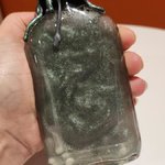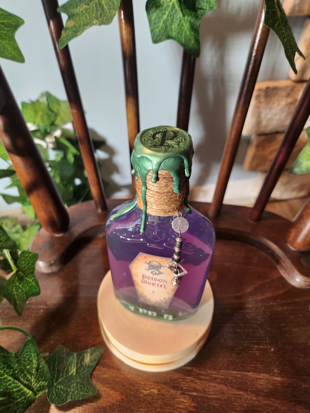 Flacon scellé d’un bouchon recouvert de cire finissant par un P (de poison), avec une étiquette décorative.
