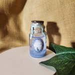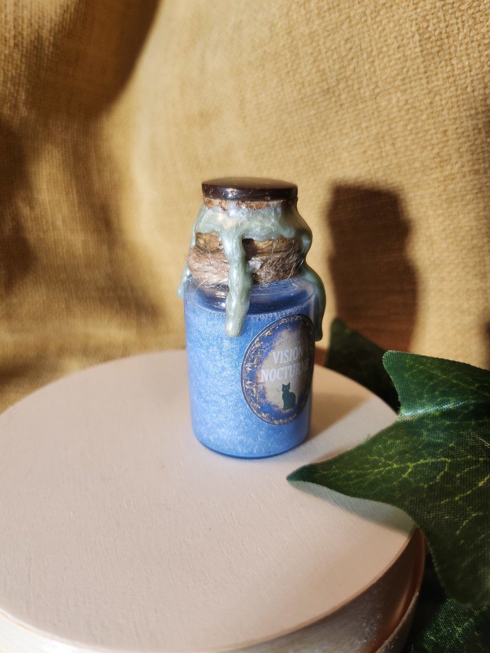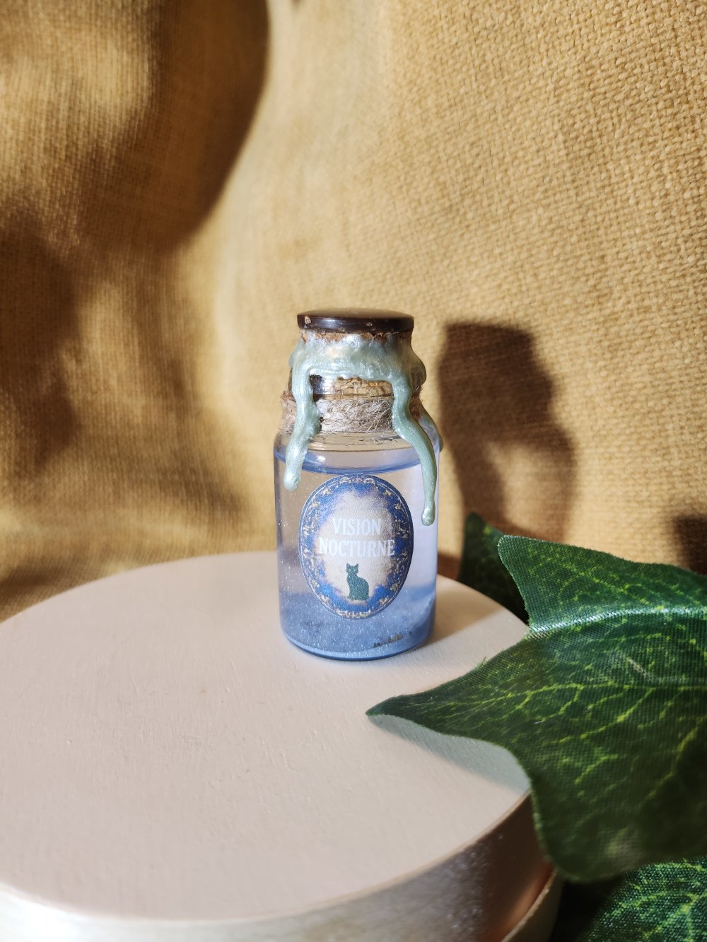 Flacon en verre scellé d’un bouchon recouvert de cire, avec une étiquette décorative. Potion phosphorescente, Secouez-la devant une source de lumière puis observez la dans le noir total.