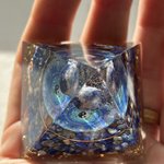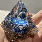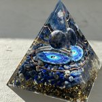 Magnifique pyramide orgonite réalisée avec de véritables pierres de lapis-lazuli, aux tons bleu royal et or. Au centre, une sphère céleste assortie flotte dans la résine, accompagnée d’un disque décoratif orné du symbole Yin & Yang, symbole d’équilibre et d’harmonie.