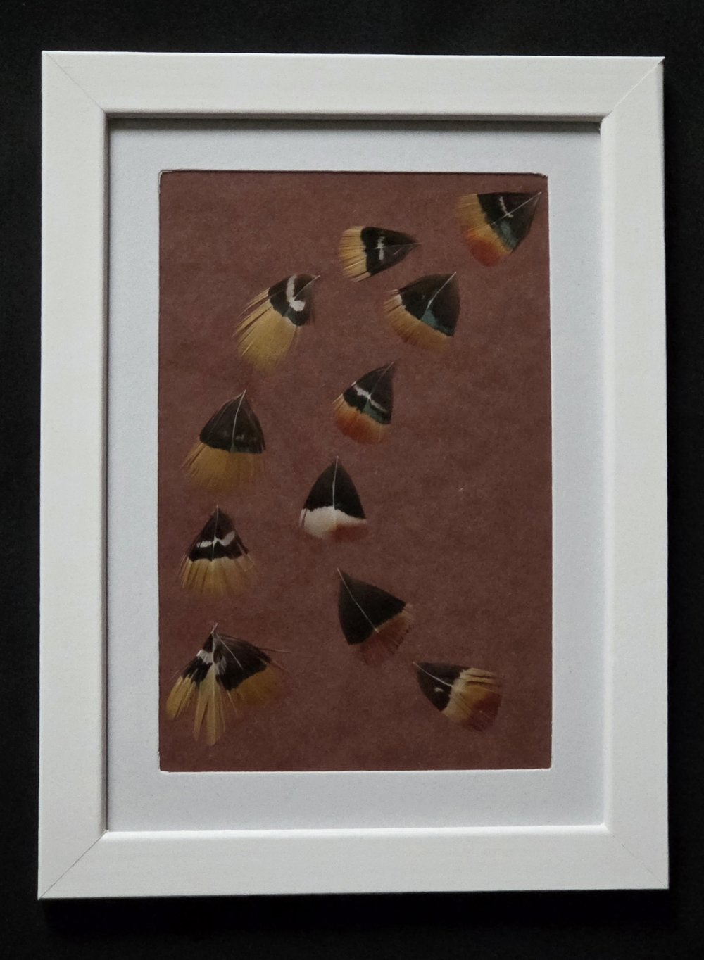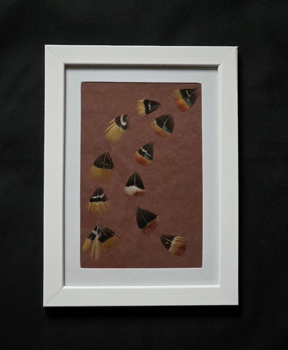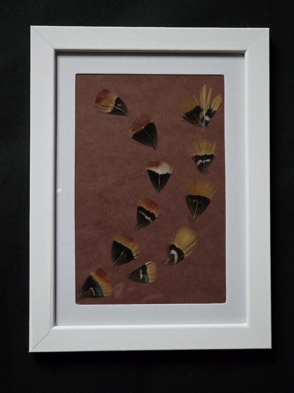 Récemment, j’ai eu envie de « mettre en scène » ces plumes d’oiseaux, sous forme de cadres décoratifs, en y intégrant parfois d’autres matériaux naturels. Parfois, je réalise moi-même l’encadrement. Chaque pièce est unique, créée au gré de mon imagination, de ma sensibilité et de mon inspiration du moment.