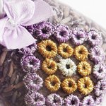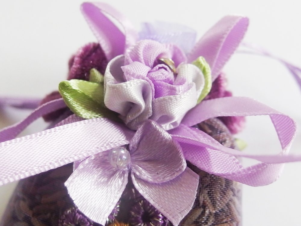 Le pochon est en organza violet ; des fleurs en tissu (satin et velours) dont certaines avec strass et des noeuds satin sont disposés délicatement en décoration sur le haut du sachet. Une composition en fils lamés est apposée sur le devant.