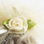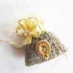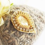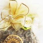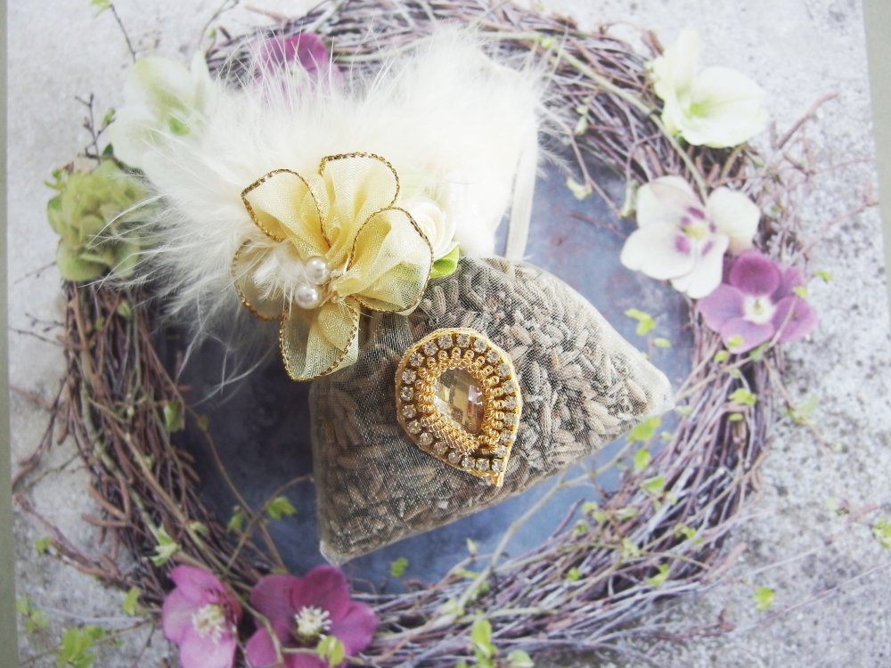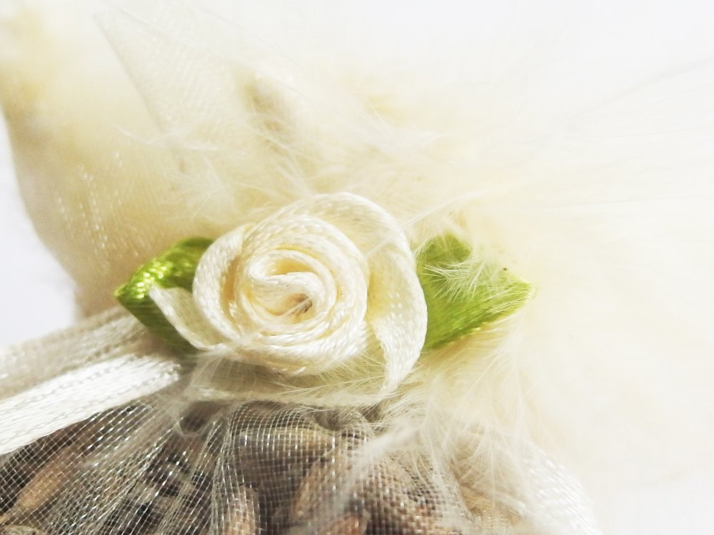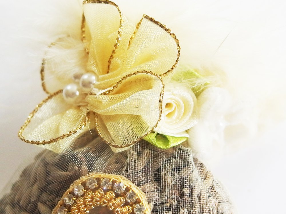 Le pochon est en organza ; des fleurs organza et velours avec perles nacrées, d'autres fleurs et et noeud en satin sont disposés délicatement en décoration sur le haut du sachet qui est entouré de plumes légères. Une palmette Indienne avec strass et cannetille est apposée sur le devant.