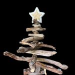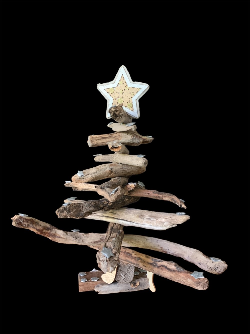 Sapin de Noël en bois flotté pour Noël 2025, éco responsable. Arbre de Noël en bois flotté 1 étoile au sommet, et quelques étoiles argentées sur les branches. Hauteur 48 cm. Fabrication artisanale en bois flotté. Arbre de Noël en bois flotté. Pièce unique en bois flotté pour Noël. Décorations de Noël en bois flotté. Arbre de Noël Made in France. Sapin de Noël fait main dans le sud de la France.