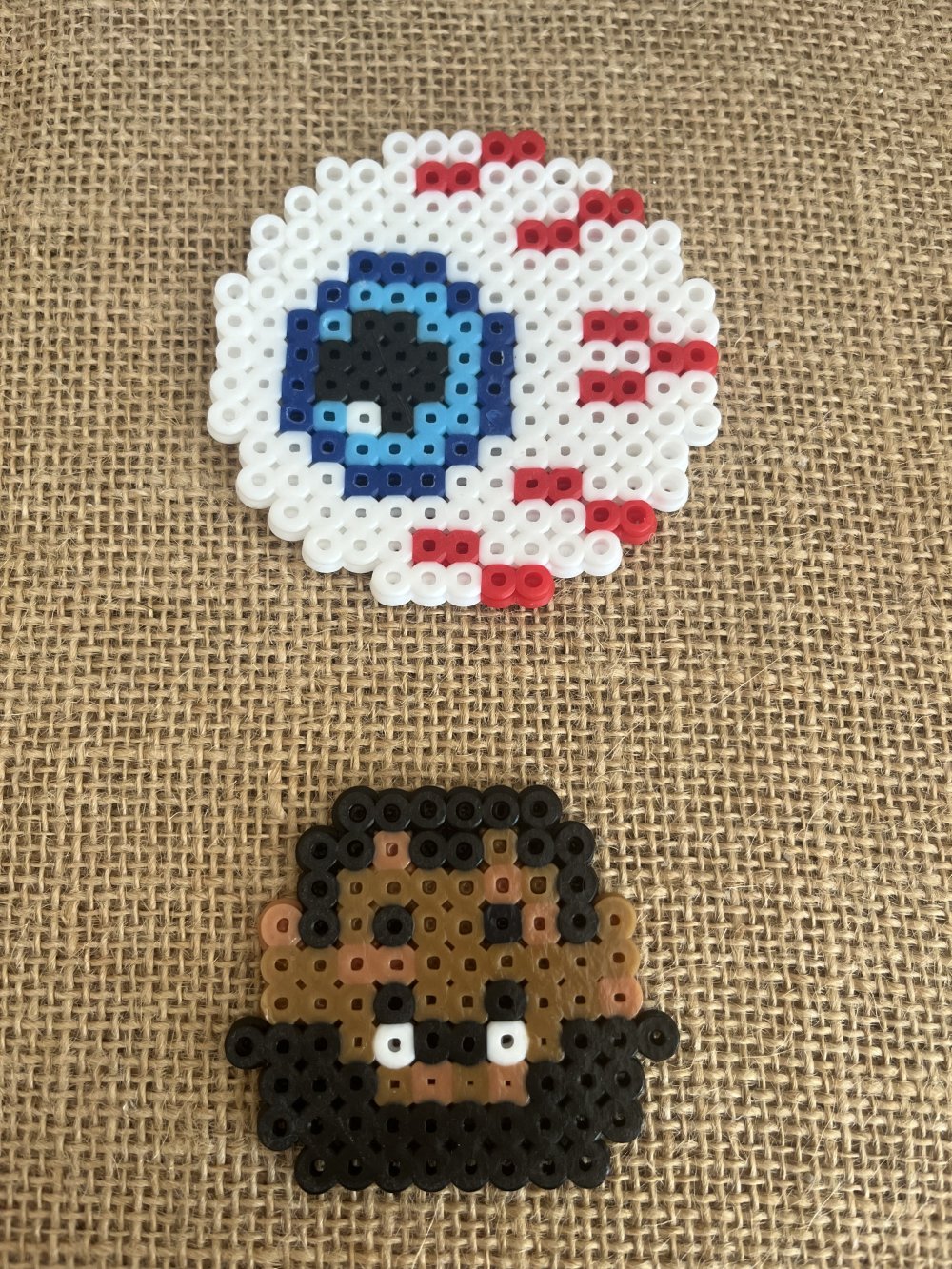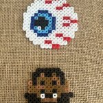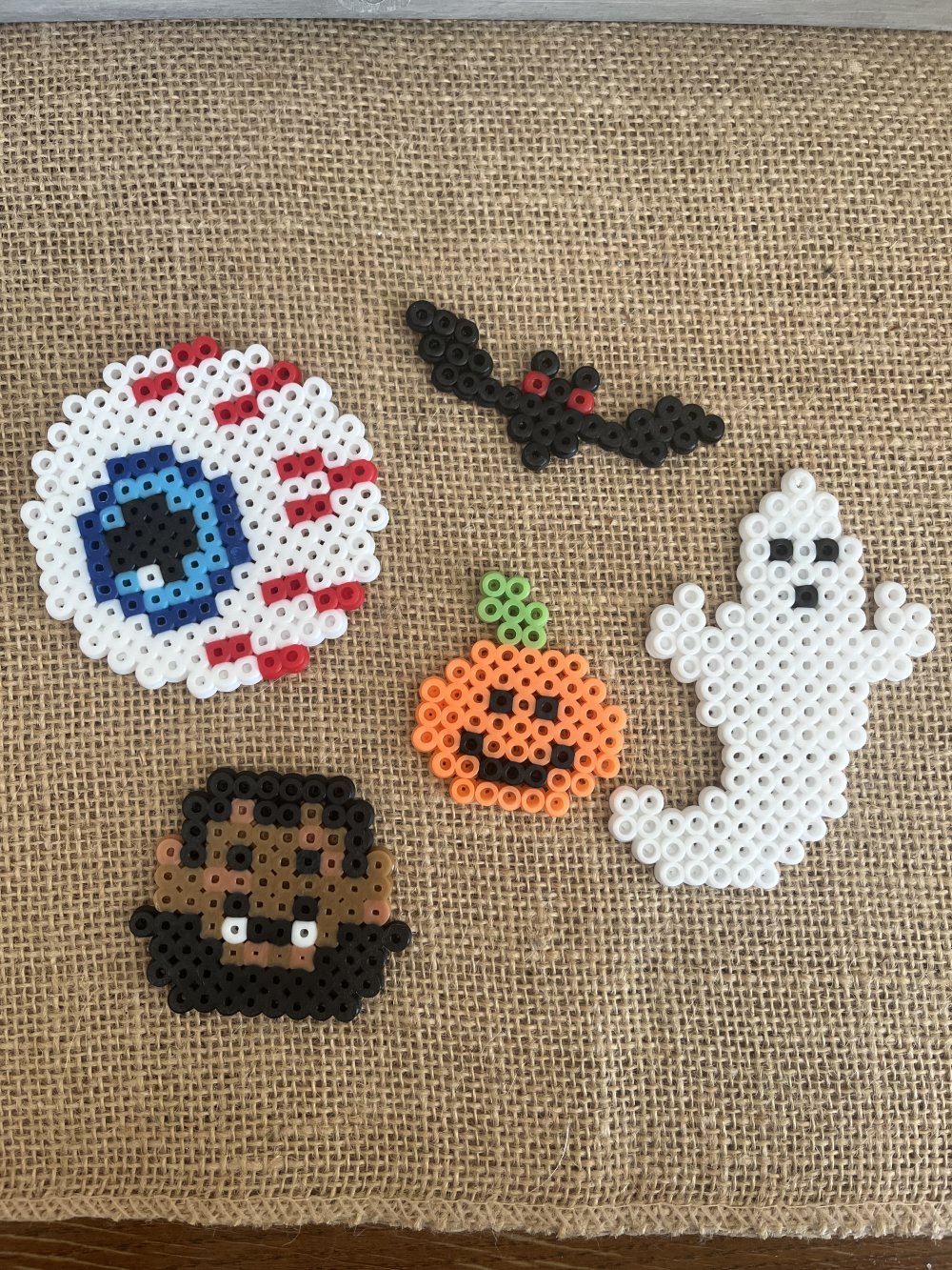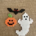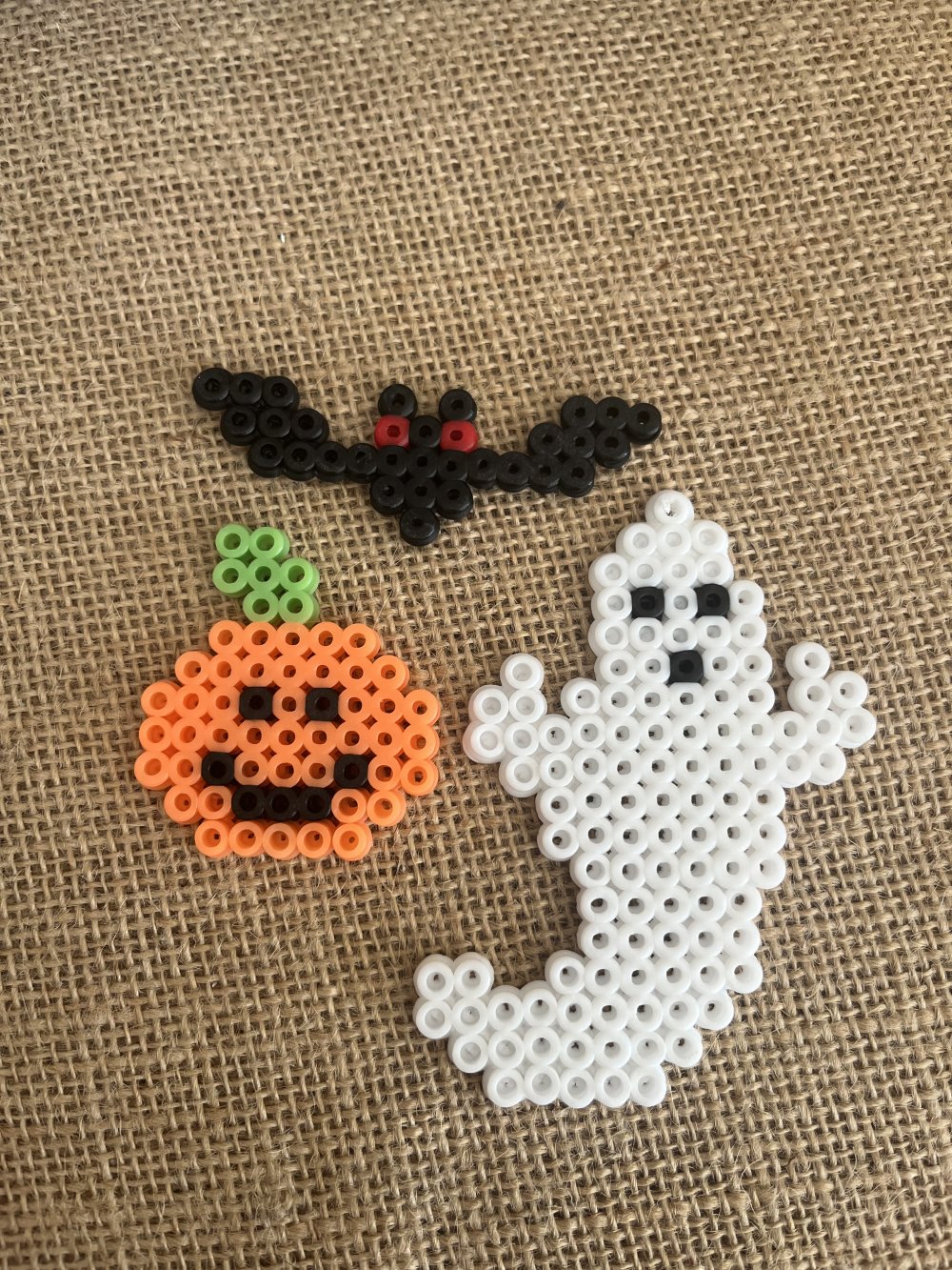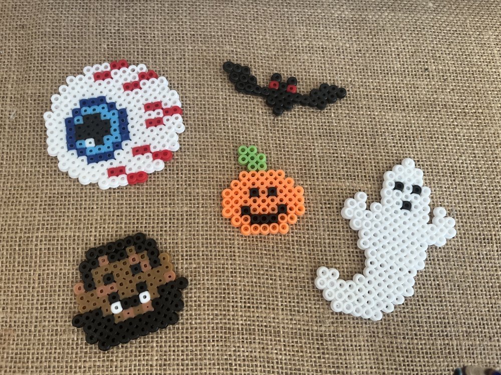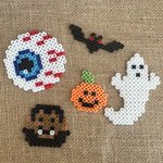 Pour effrayer tous les petits copains et copines, voici 5 suspensions réalisées en perles hama. Vous avez Dracula, un œil bien globuleux, 1 citrouille et 1 chauve-souris .