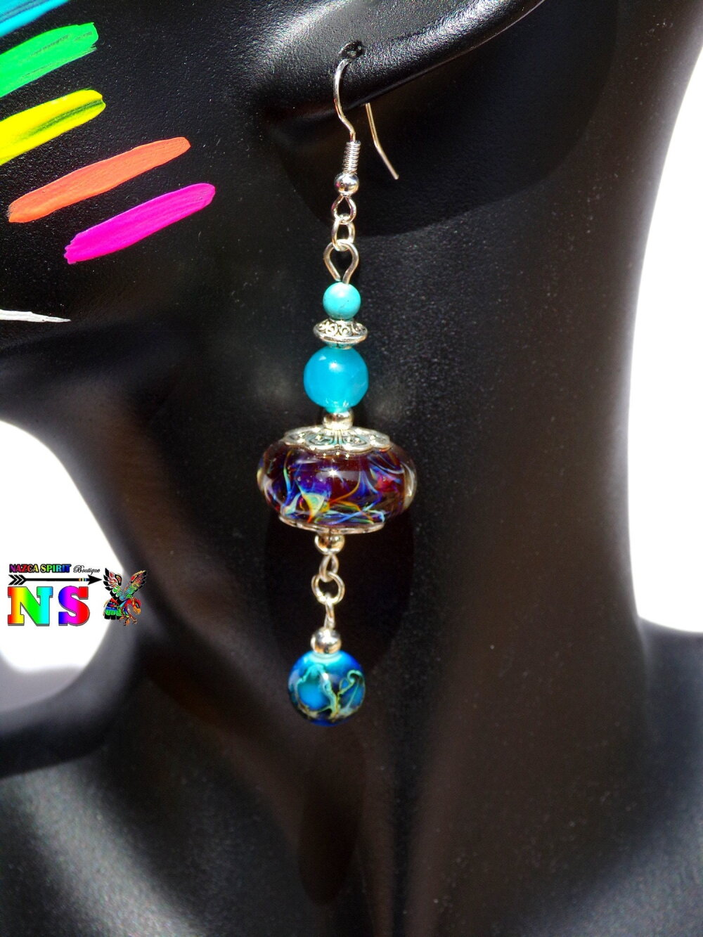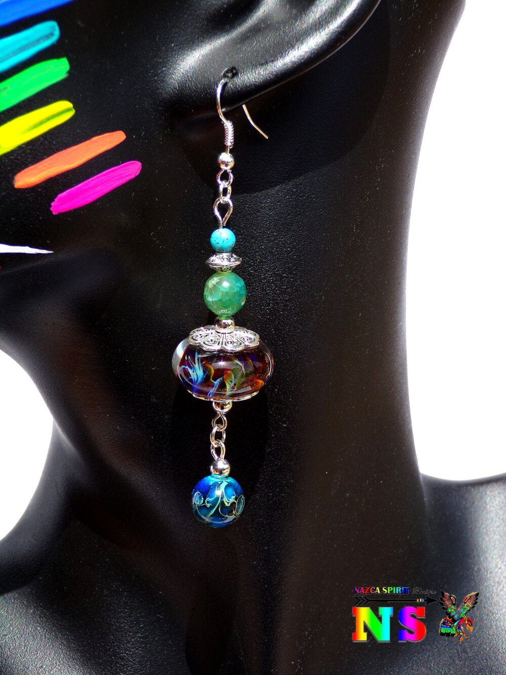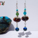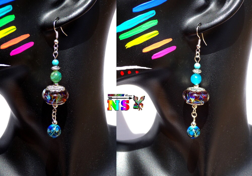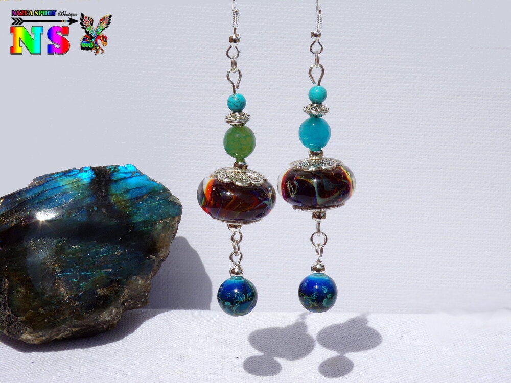 Matériaux : verre filé au chalumeau (Origine : Arizona-USA), turquoises naturelles (origine ; USA), agates veine de dragon (Origine : Tibet), cuivre plaqué argent, verre (origine : Italie)