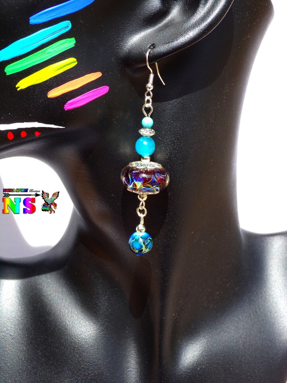 Au bout des pendants, j'ai relié des perles en verre qui proviennent d'Italie, et qui offrent de magnifiques effets colorés passant du bleu cobalt au bleu turquoise avec de petites touches de vert émeraude, le tout rehaussé par de fins motifs dorés. Lorsque vous observez ces perles de près, vous avez l'impression d'avoir des petits bouts d'océan au bout de vos lobes d'oreille.