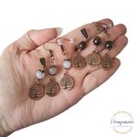 Voici Aelys, une jolie collection de 4 parures en métal cuivré avec pierres naturelles 8 mm bleues, vertes clair, roses et marrons. Chaque parure est composée d'un pendentif et une paire de boucles d'oreilles avec de jolies breloques arbre de vie.