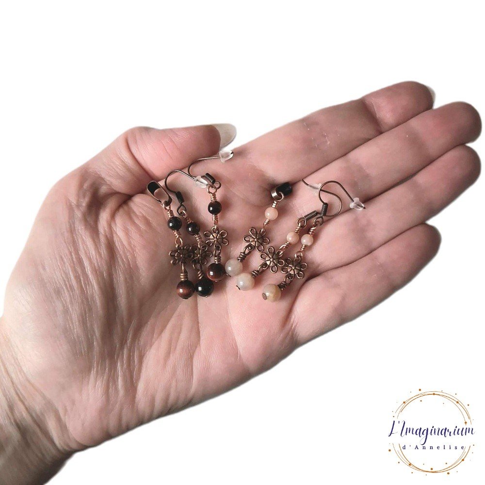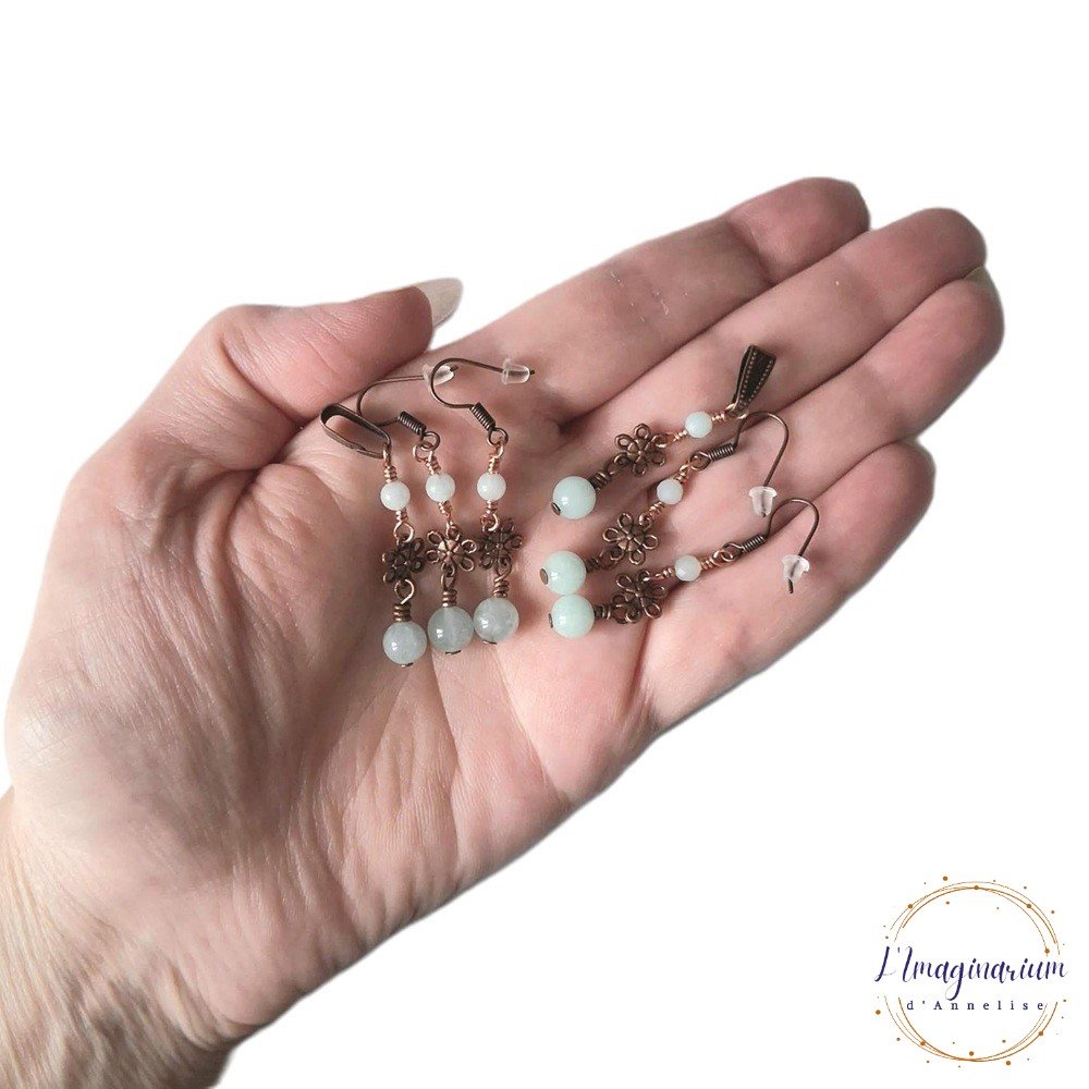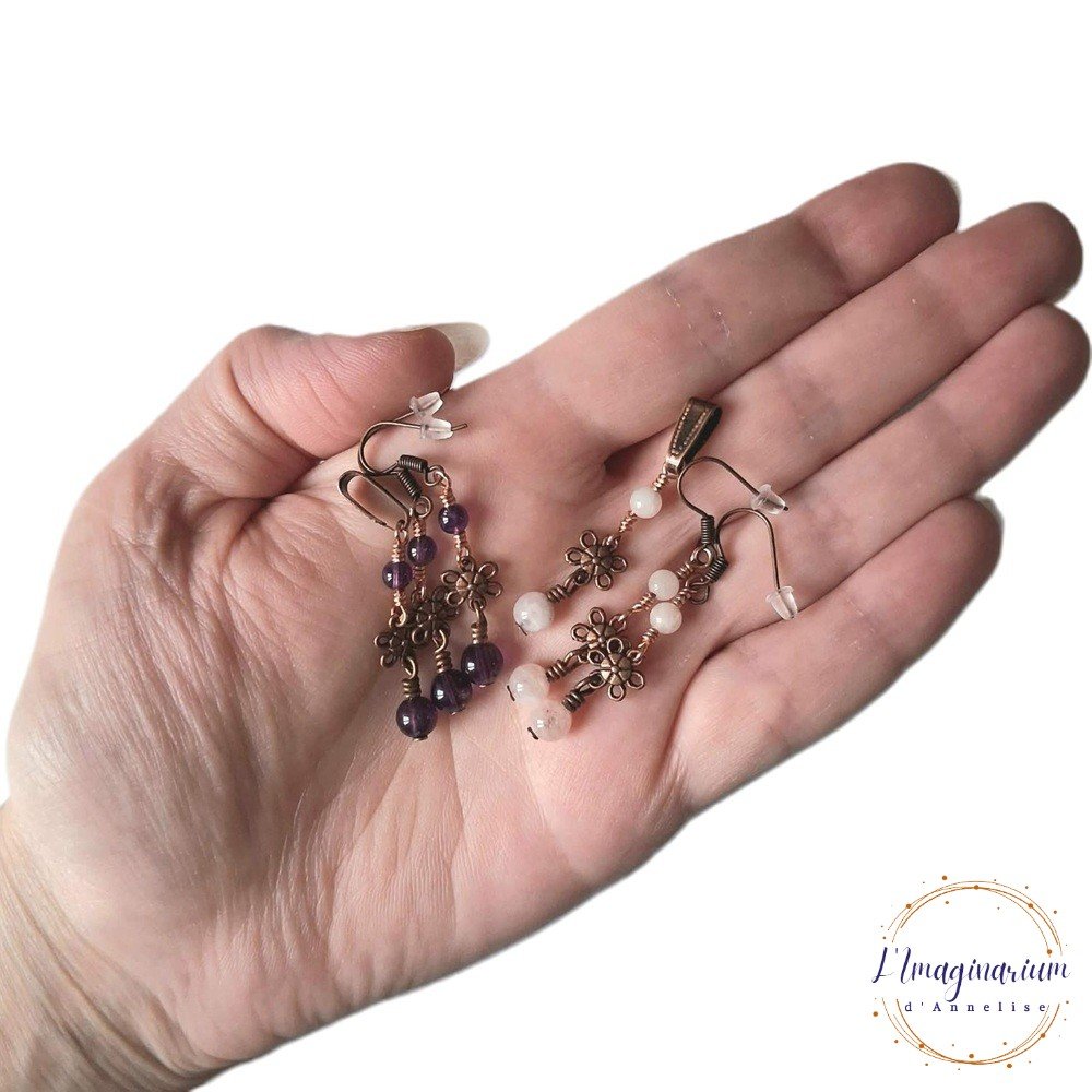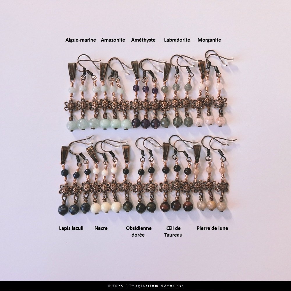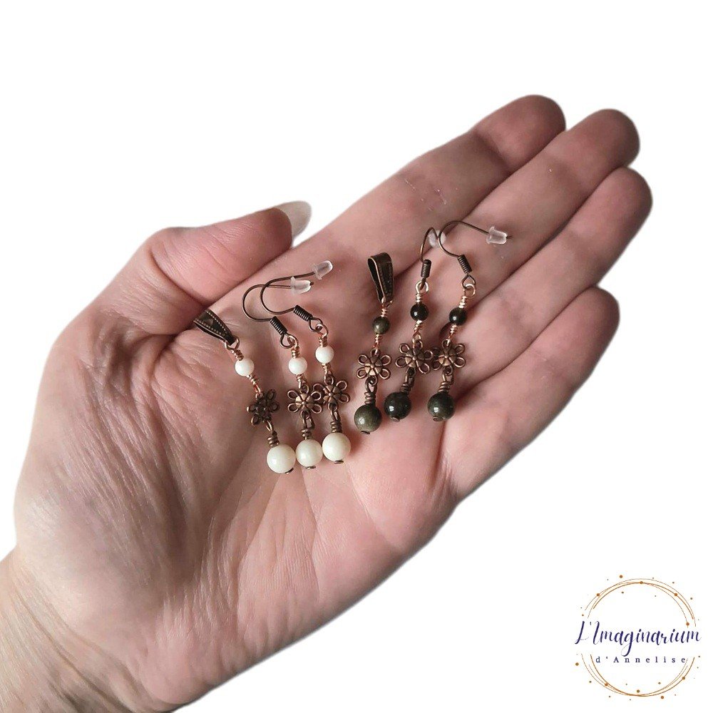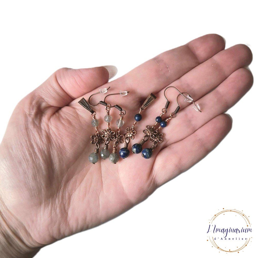 Voici Anatoline, une jolie collection de 10 parures en métal cuivré avec pierres naturelles 4 mm et 6 mm bleues, violettes, grises, roses, blanches, noires, rouges. Chaque parure est composée d'un pendentif et une paire de boucles d'oreilles avec de jolis connecteurs.