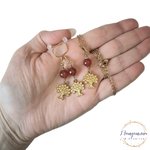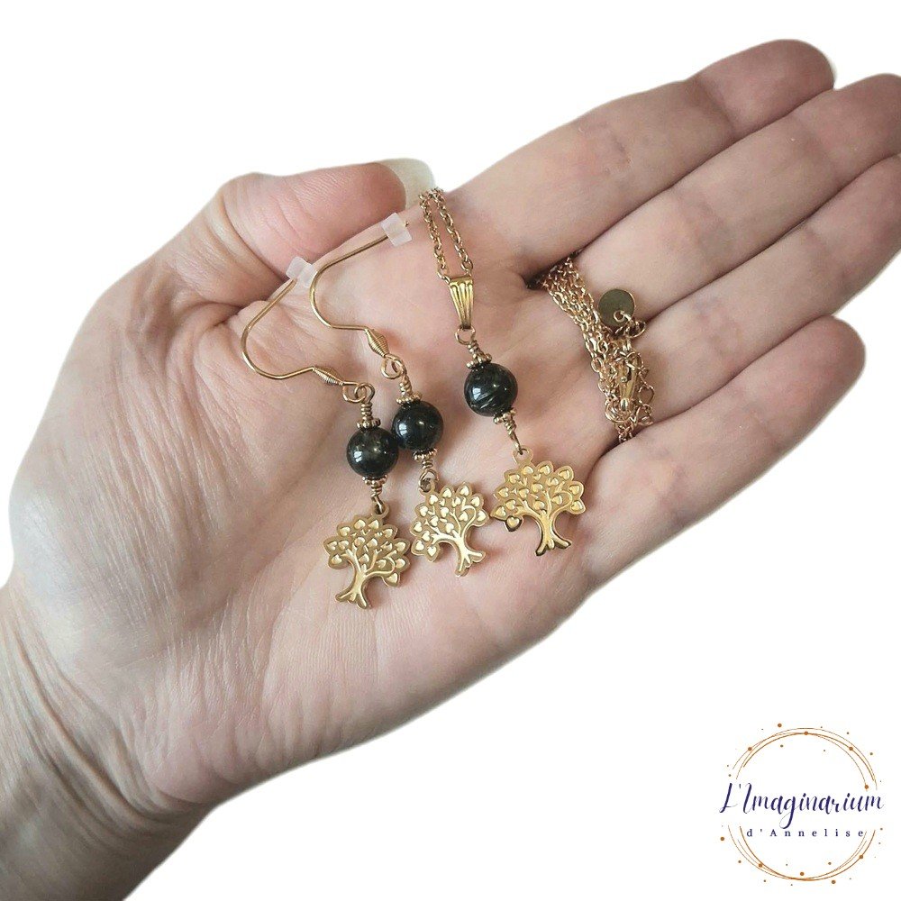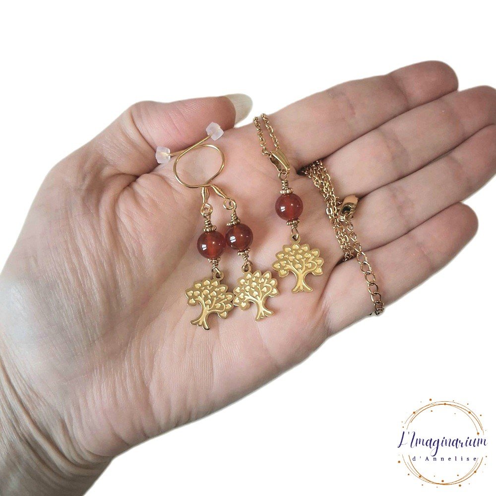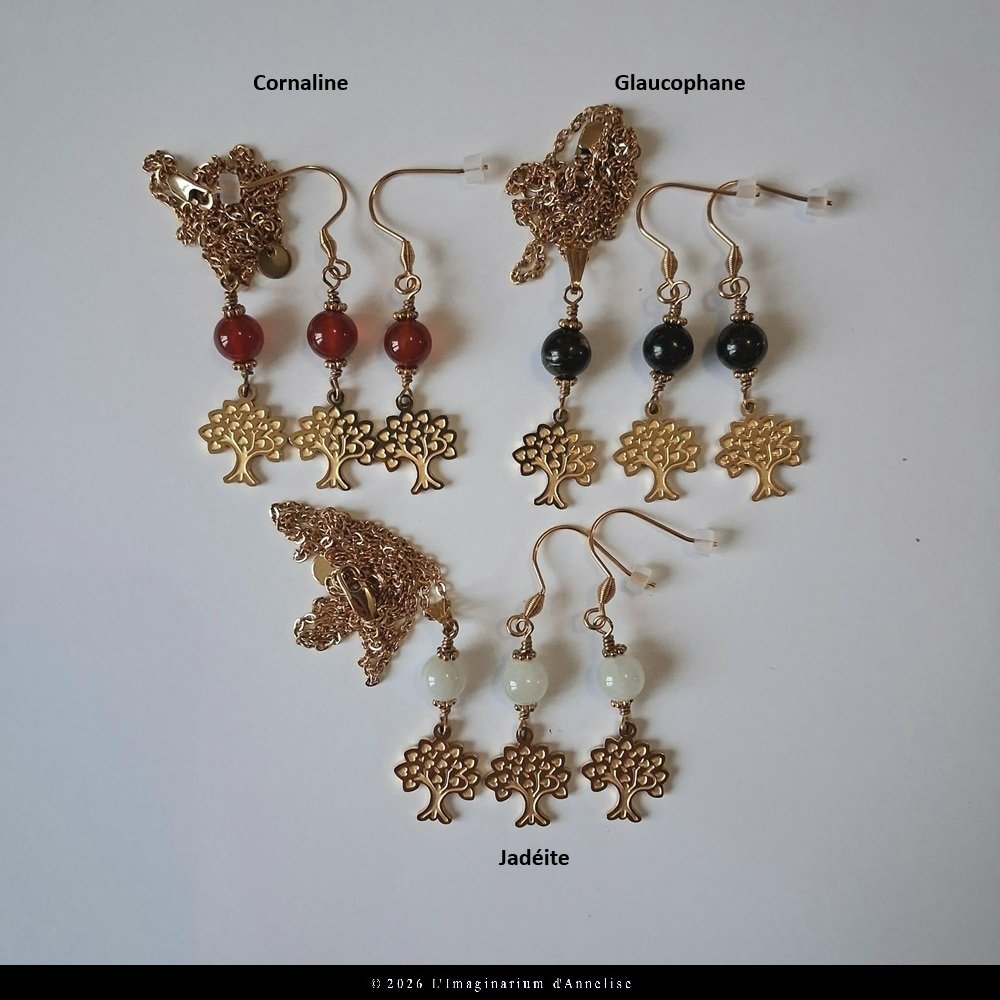 Voici Heiline, une jolie collection de 3 parures en acier inoxydable doré avec pierres naturelles 8 mm rouges, noires et vertes clair. Chaque parure est composée d'un pendentif et une paire de boucles d'oreilles avec de jolies breloques arbre de vie.