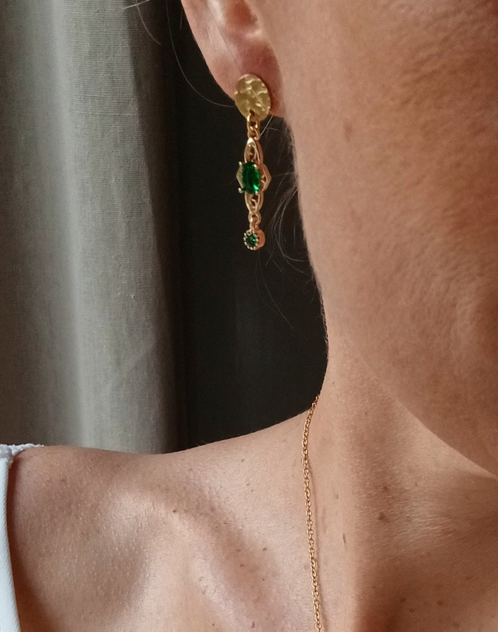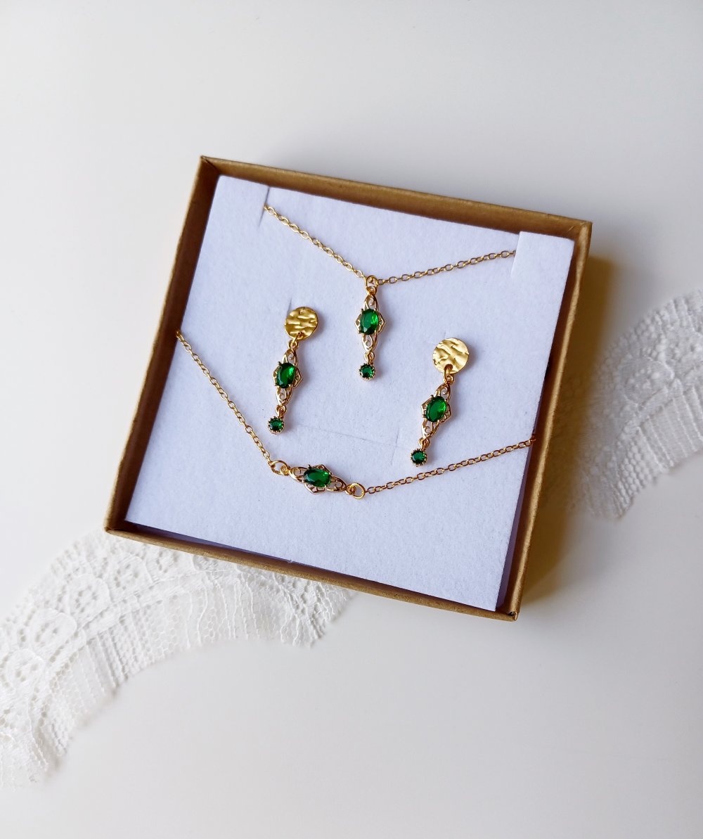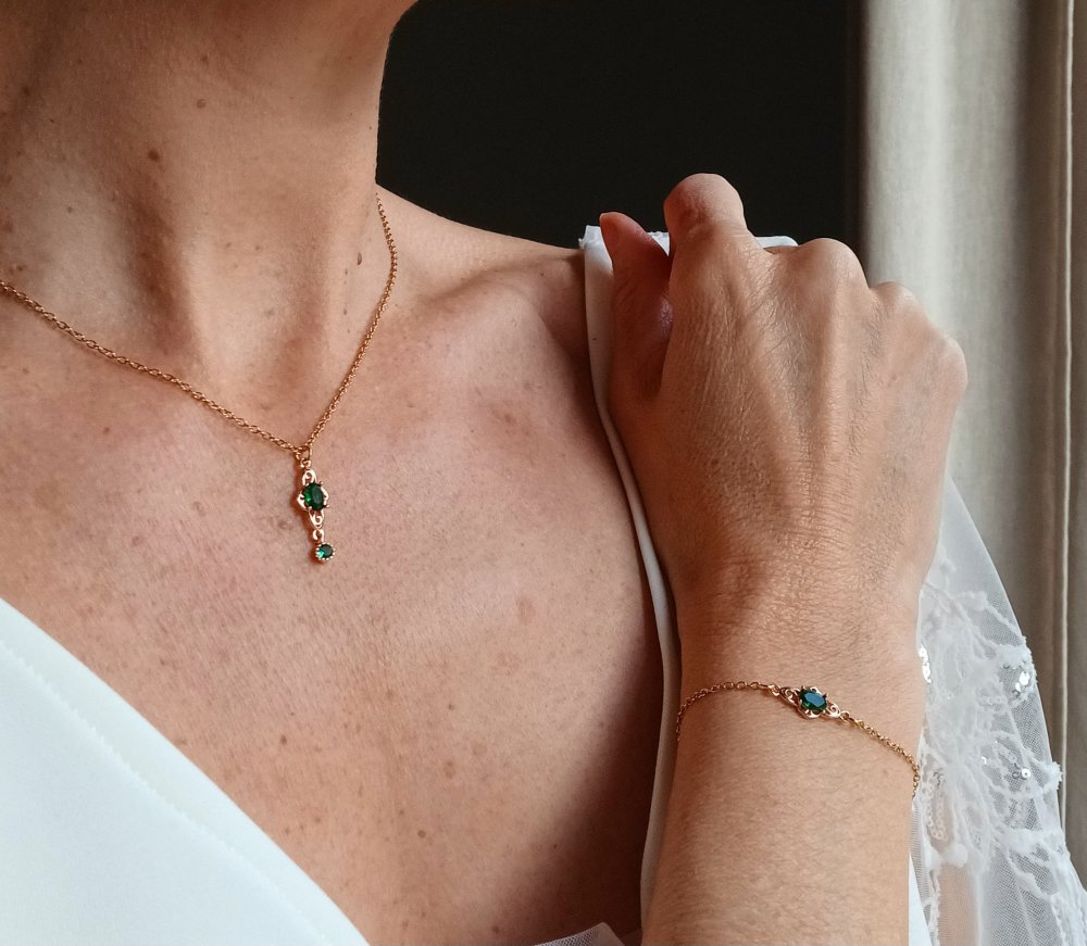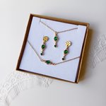Parure bijoux vert émeraude et or- collier + bracelet + boucles d'oreilles- bijoux de mariée chics et tendance à l'esprit bohéme.
