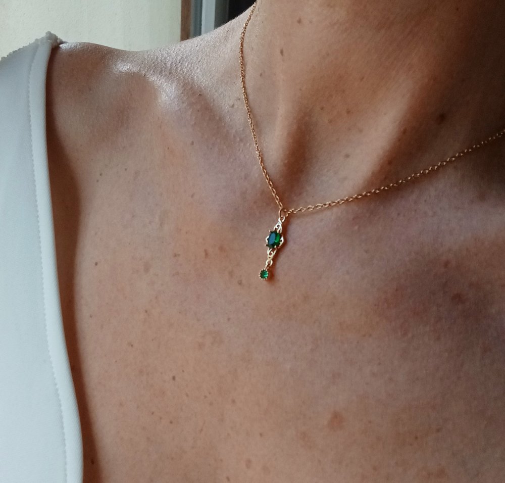 Cette sublime parure est composé d'un joli collier près du cou avec pendentif vert émeraude, longueur sur mesure à choisir dans l'onglet option.