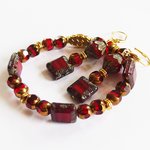 Belle harmonie dans les tons de rouge et d'or pour ce bracelet et sa paire de boucle d'oreilles assortie, esprit Edwardian début de siècle, avec de jolies perles en verre Tchèque polies au feu, perle et rondelles en métal doré