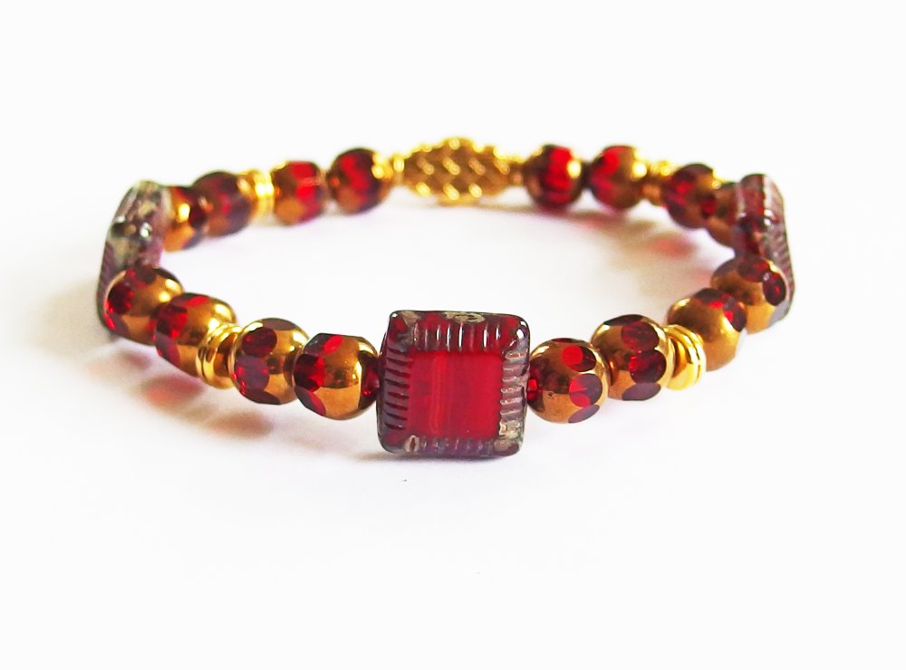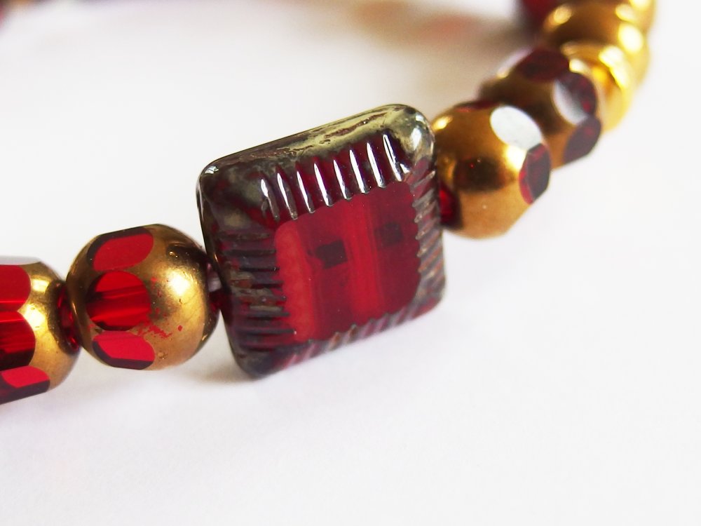 Belle harmonie dans les tons de rouge et d'or pour ce bracelet et sa paire de boucle d'oreilles assortie, esprit Edwardian début de siècle, avec de jolies perles en verre Tchèque polies au feu, perle et rondelles en métal doré