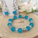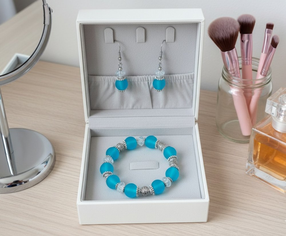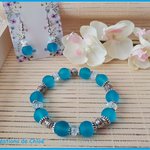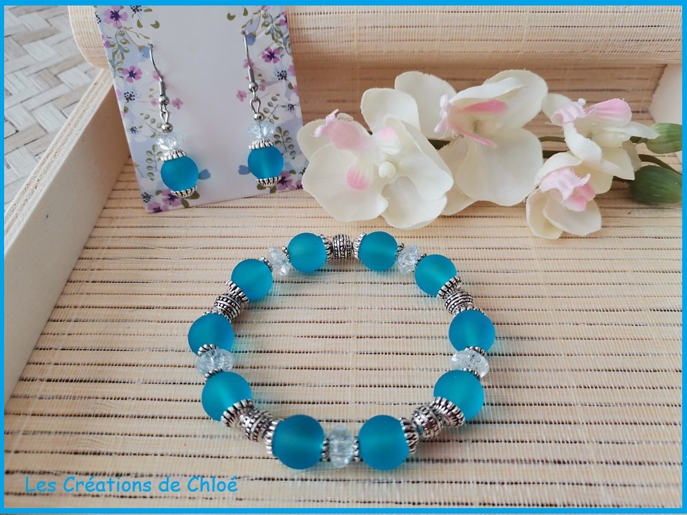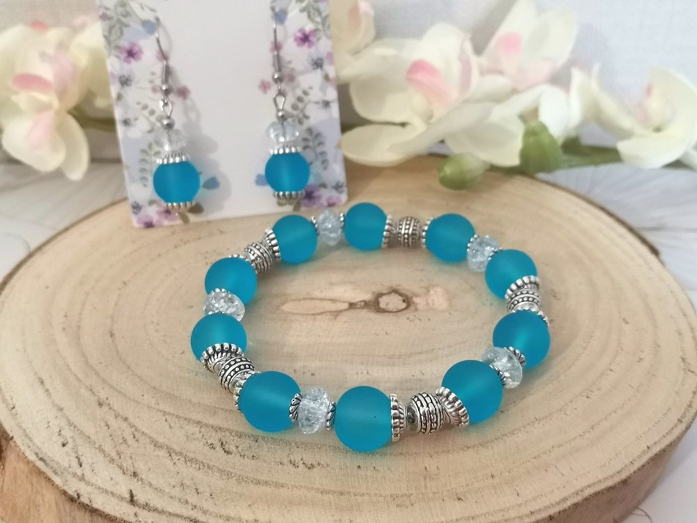 Jolie parure de bijoux composé d'un bracelet en perles en verre givrée de 10 mm de couleur bleue avec les boucles d'oreilles assorties. Apprêts de couleur argent mat en alliage sans plomb et sans cadmium. Les crochets de boucles d'oreilles sont en acier inoxydable