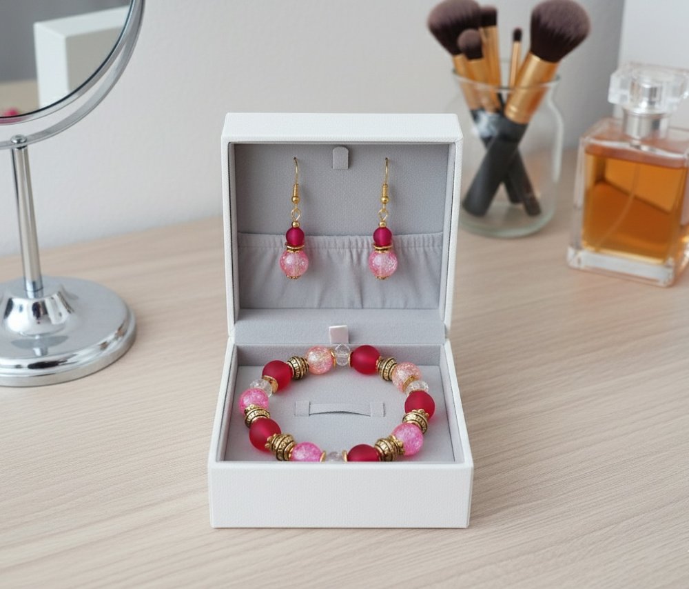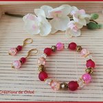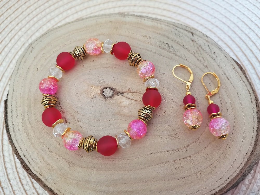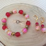 Jolie parure de bijoux composé d'un bracelet en perles de verre de 10 mm de couleur rose/rouge et cristal avec les boucles d'oreilles assorties. Apprêts de couleur doré en alliage sans plomb et sans cadmium.