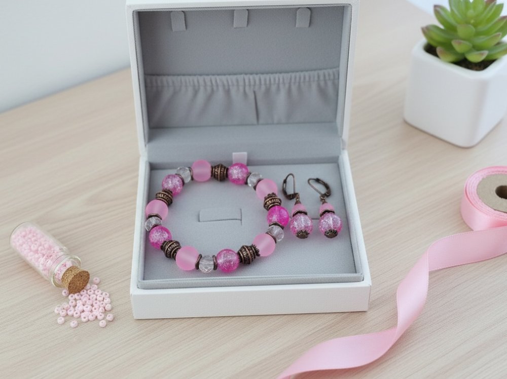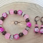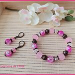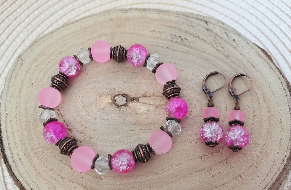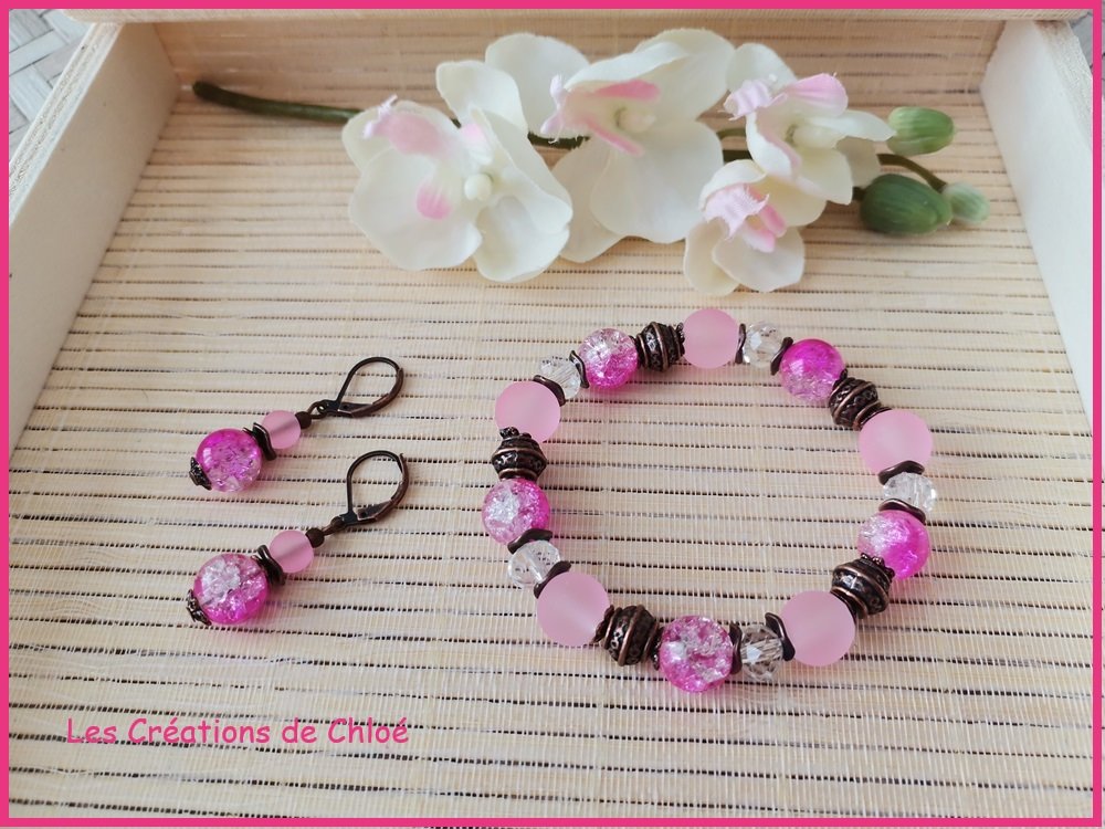 Jolie parure de bijoux composé d'un bracelet en perles de verre de 10 mm de couleur rose/fuchsia et cristal avec les boucles d'oreilles assorties. Apprêts de couleur cuivre rouge en alliage sans plomb et sans cadmium.