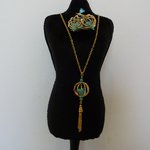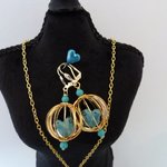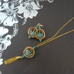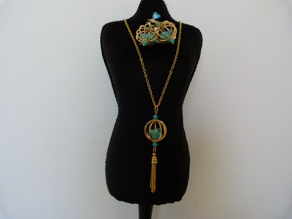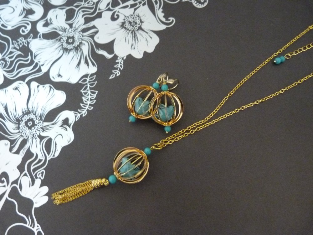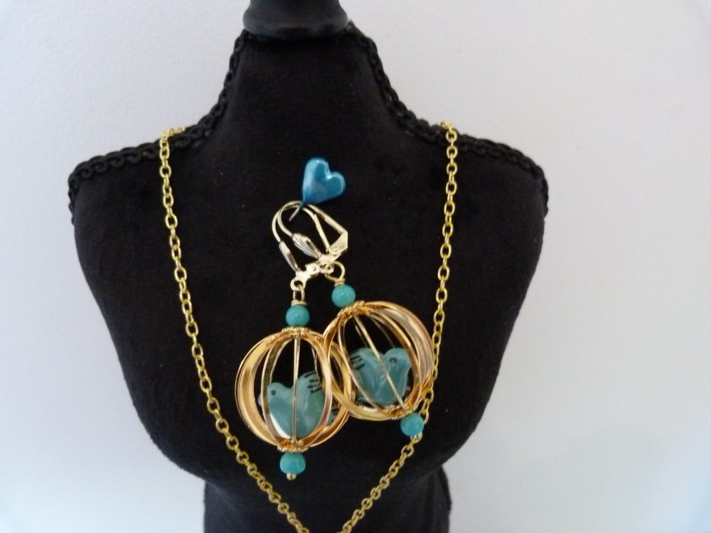 Parure composée d'un sautoir en métal doré comportant une cage ronde dans laquelle se trouve un oiseau bleu turquoises et de boucles d'oreilles assorties.