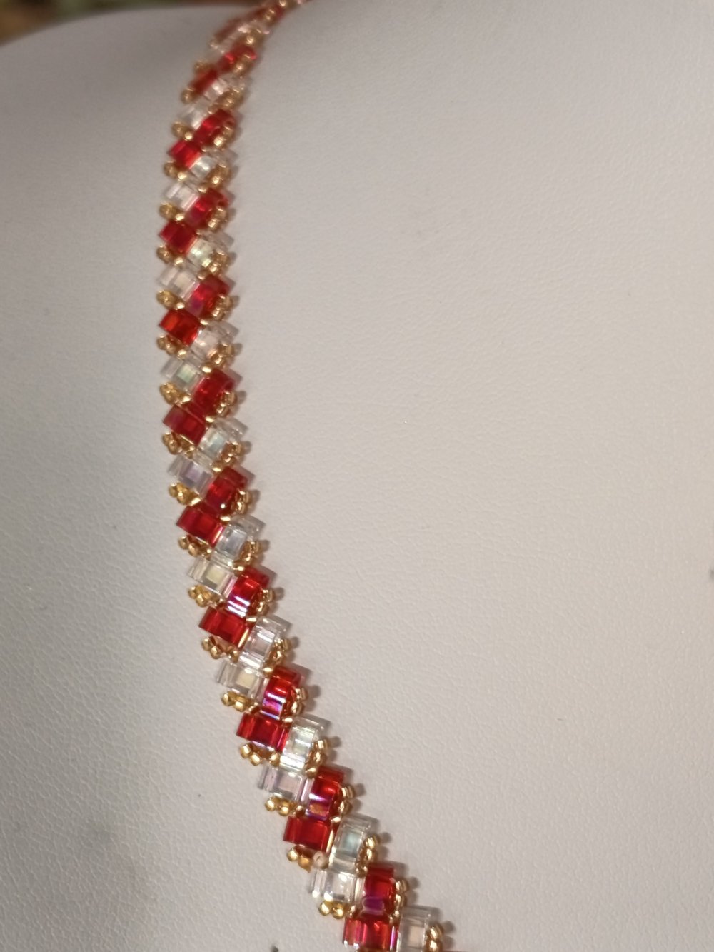 - Collier ras du cou tissé à la main en perles Miyuki Half Tila et Miyuki Delica. Il mesure 40 cm + 5 cm de chaine d'extension. le tout en acier inoxydable
