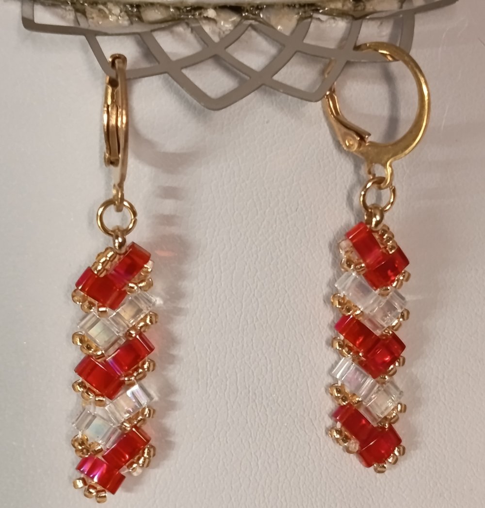 - Boucles d'oreilles tissées à la main en perles Miyuki Half Tila et Miyuki Delica.