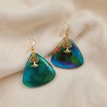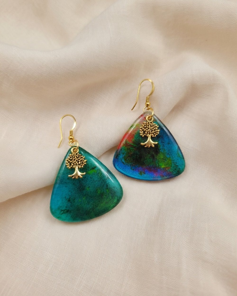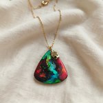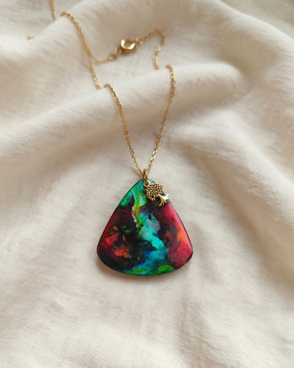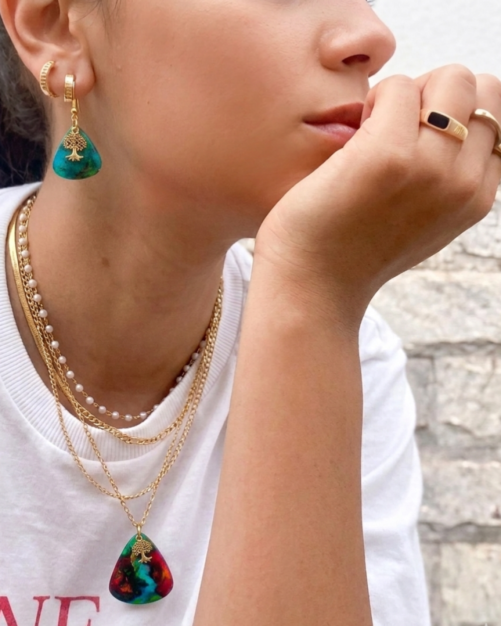 Voici la rencontre explosive des encres vibrantes et de l'acier doré. Notre parure "Eden" capture l'instant où la couleur prend vie, se transformant en une forêt enchantée à votre cou et à vos oreilles.