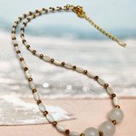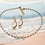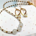 Une parure délicate et lumineuse composée d’un collier raffiné et de boucles d’oreilles assorties. Les perles blanches nacrées en verre et les perles dorées se marient avec élégance, tandis que les boucles au design doré et épuré apportent une touche moderne et chic.