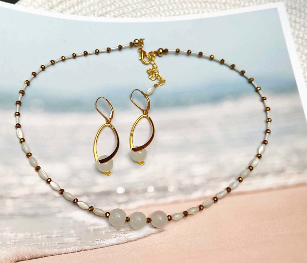 Parure collier boucles d'oreilles perles en verre et nacre