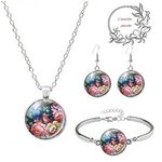 Un collier réaliser avec un support en acier inoxydable rehausser de son cabochon en verre, d'un bracelet et son cabochon et d'une paire de boucle d'oreille.