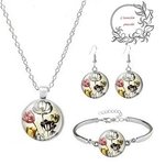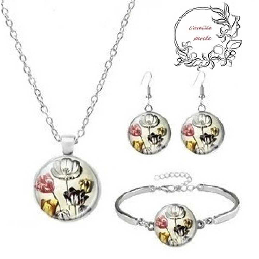 Un collier réaliser avec un support en acier inoxydable rehausser de son cabochon en verre, d'un bracelet et son cabochon et d'une paire de boucle d'oreille.