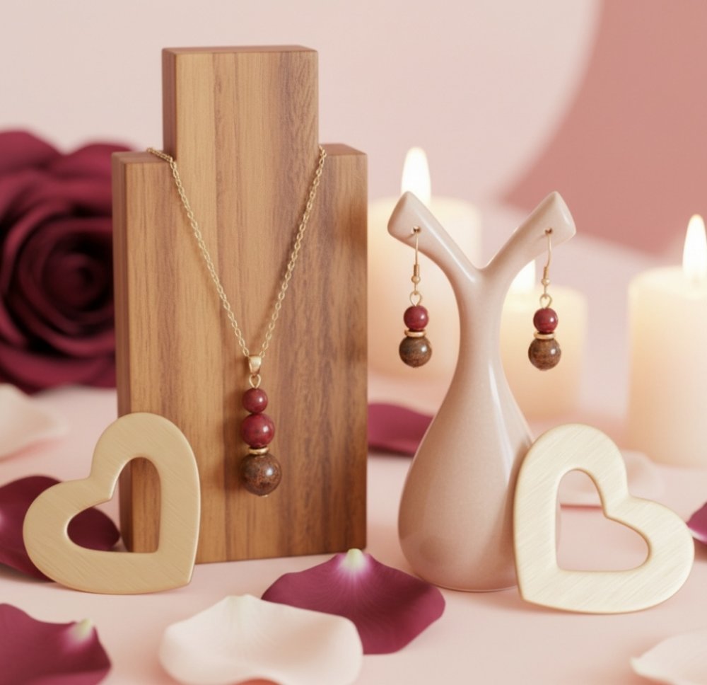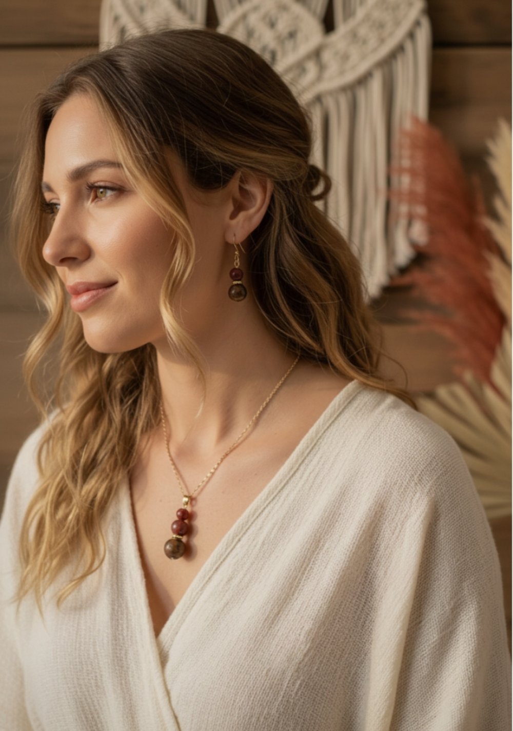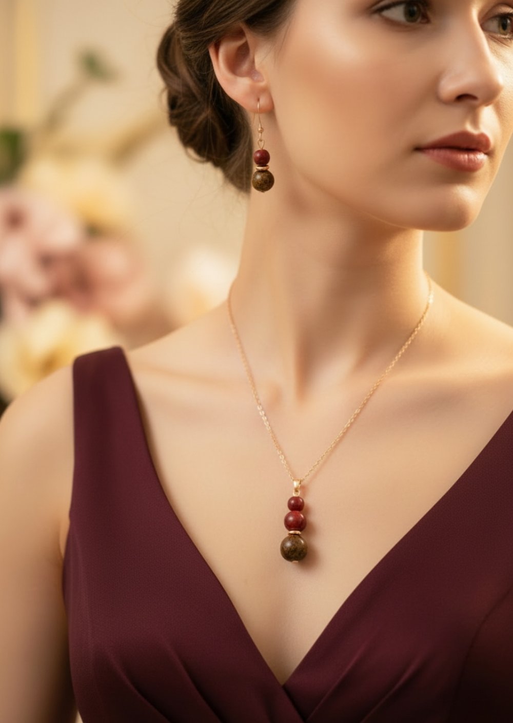 parure faite à la main composée d'un collier et de boucles d'oreilles assorties, créée avec des pierres naturelles de Jaspe Bréchique et de Bronzite